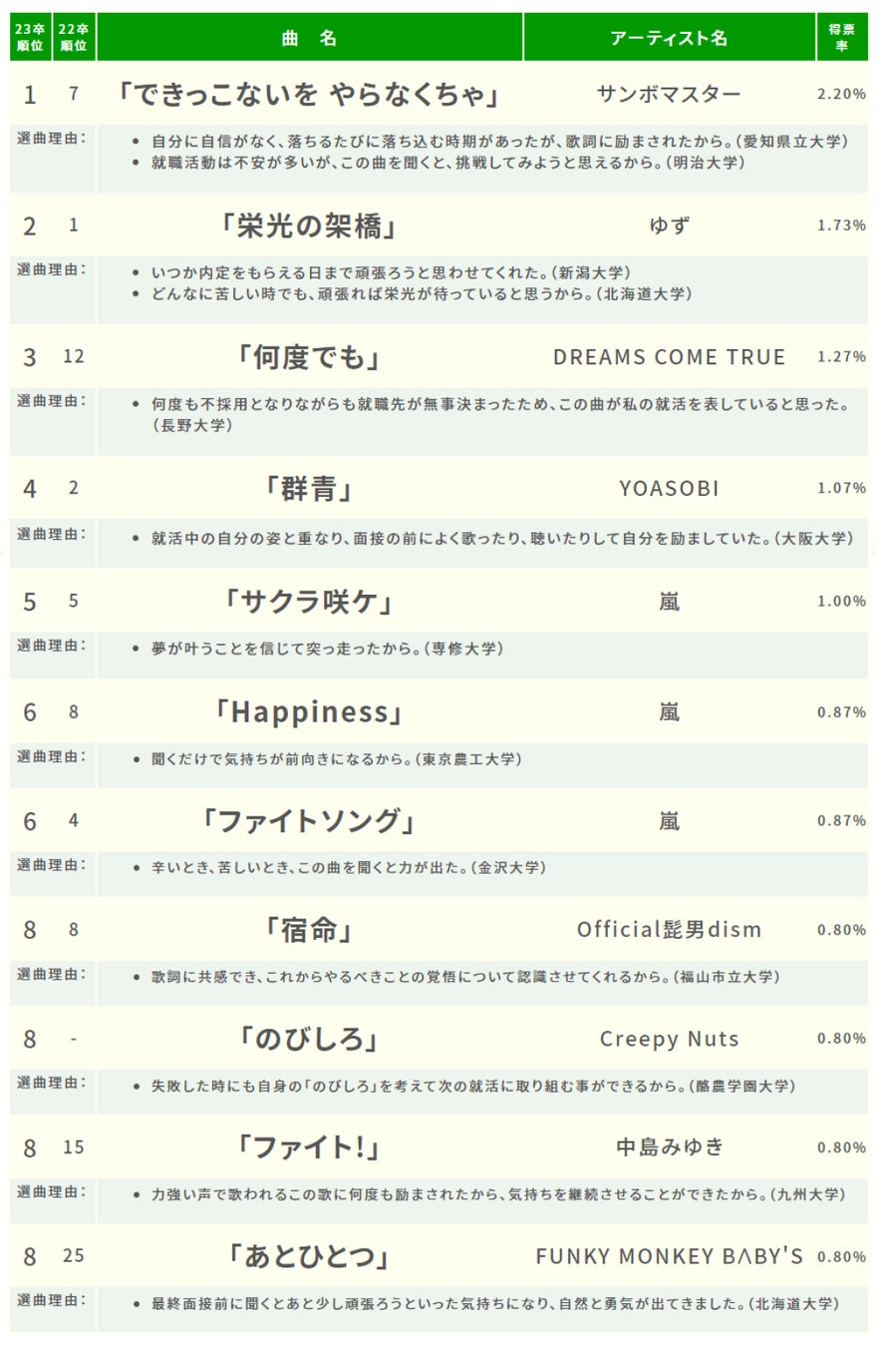 - 就職活動のテーマ曲、1位はサンボマスター「できっこないを やらなくちゃ」で5年連続トップ10入り【図2】