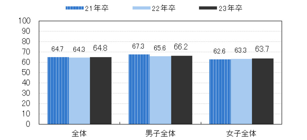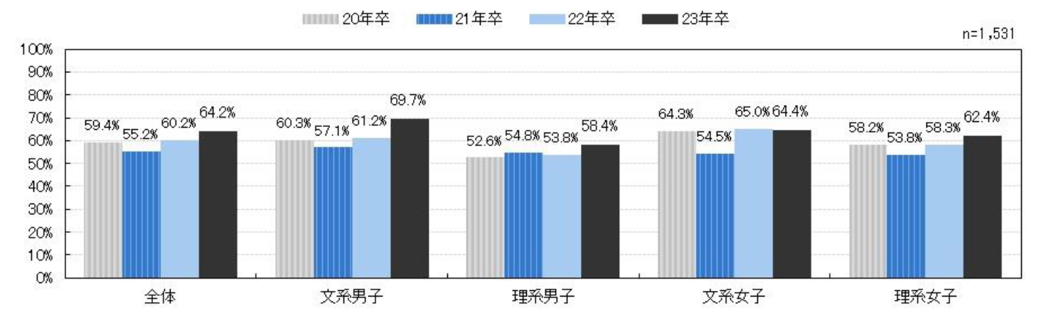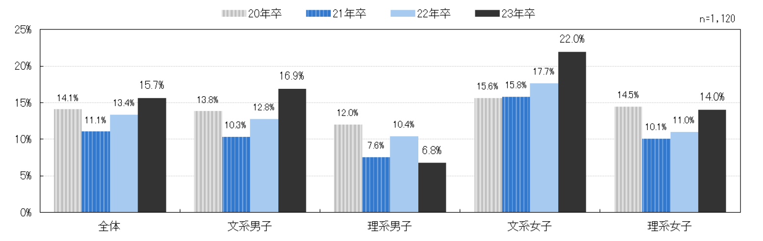 就職活動を表す漢字一文字は「楽」が3年ぶりに1位となり、コロナ禍の影響が色濃かった前年・前々年に2年連続1位だった「苦」を上回りました。一見すると最も厳しい状況は脱したかに見えますが、「苦」の得票率(5.47%)は前年(4.88%)を上回っており、就職活動が「苦」だと感じた学生の絶対数は減っていません。特に文系女子では「苦」が1位で「耐」が2位となっており、苦しさに耐えながらの就職活動だった学生が多かったようです。一方、理系は男女とも「楽」の得票率が7%超と高く、大学や大学院で学んだことを活かした就職活動ができたのではと思われます。