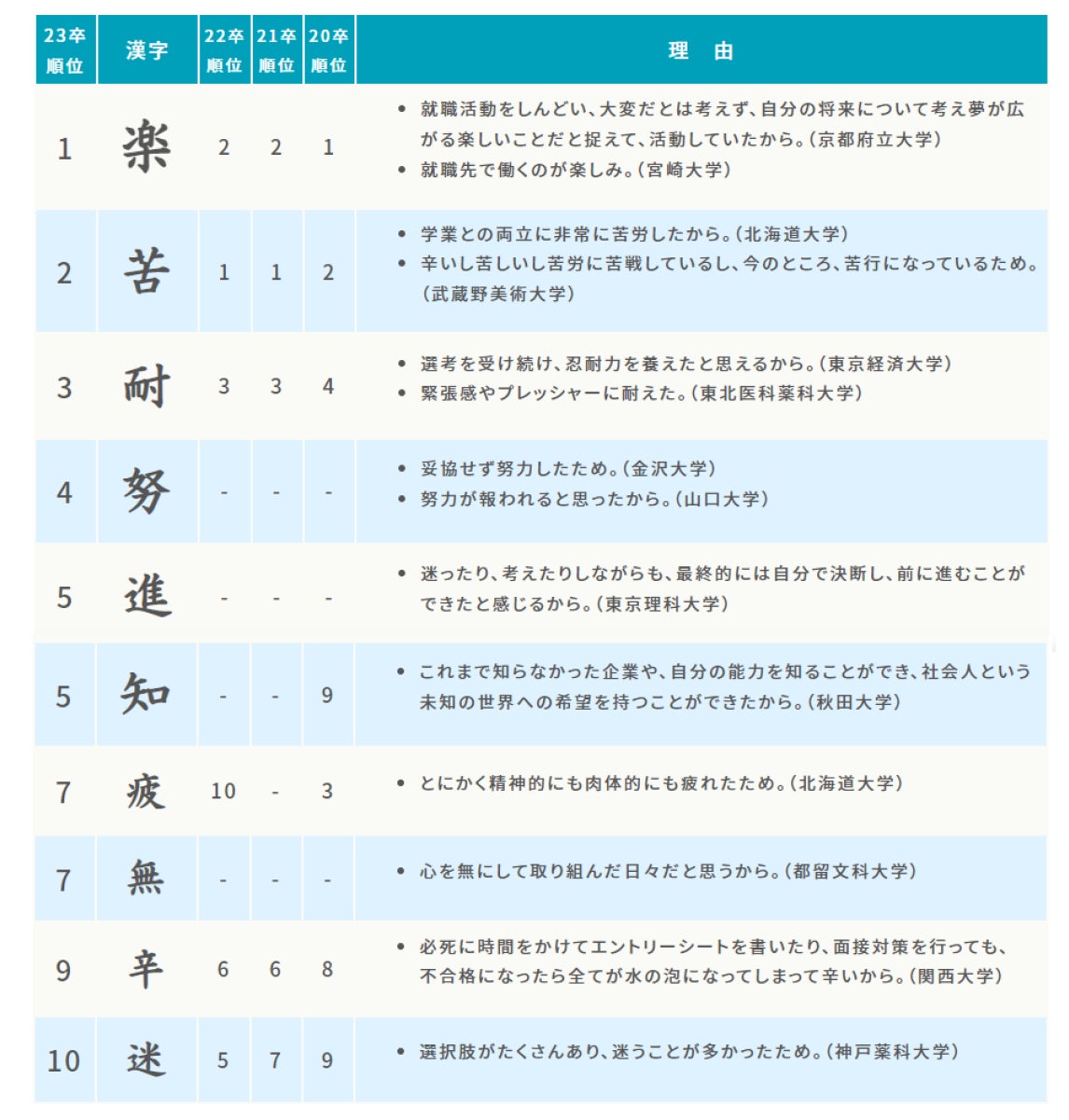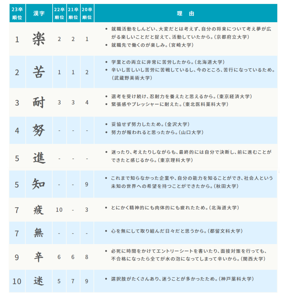 - 就活の漢字一文字は「楽」が3年ぶりに1位。前年・前々年1位の「苦」は2位に【図1】