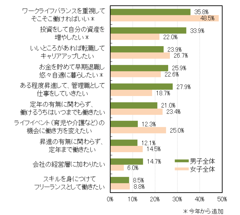 「人生100年時代」と言われるなか、何歳まで働き続けたいと思うか聞いたところ、全体の平均は64.8歳(前年比0.5pt増)で、男子全体の平均は66.2歳(前年比0.6pt増)、女子全体の平均は63.7歳(前年比0.4pt増)だった。「人生100年時代」に向けた今後の働き方について、「ワークライフバランスを重視してそこそこ働ければいい」と回答した割合が男女ともに最も割合が高かった(男子35.8%、女子48.5%)。【図6、7】