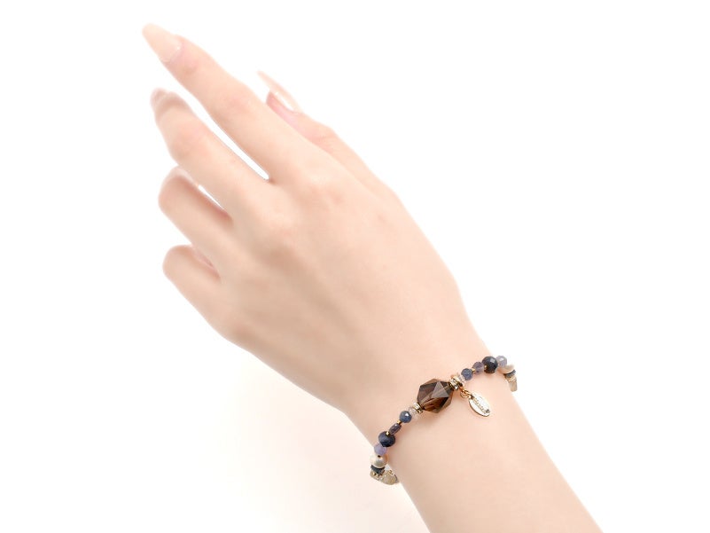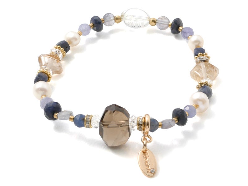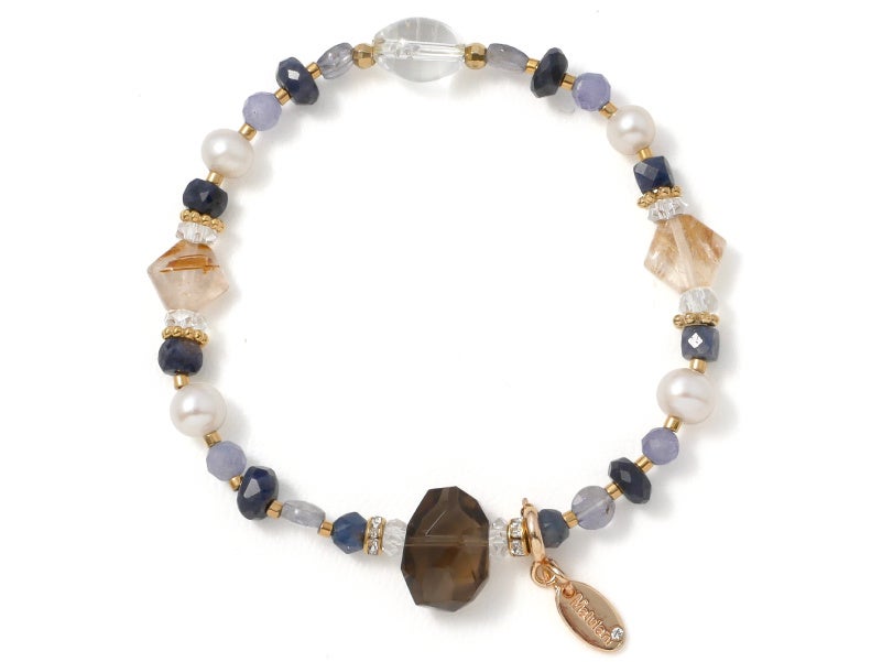 スモーキークォーツ、タンザナイト、サファイア、アイオライト、ゴールデンルチル、水晶、淡水パールを組み合わせ、不安や焦りを手放しながら、直感力や判断力を高め、仕事運・ご縁・魅力をバランスよくサポート。