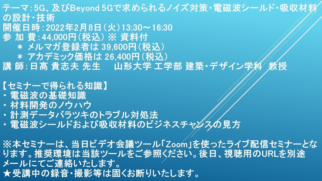 先端技術情報や市場情報を提供している(株)シーエムシー・リサーチ(千代田区神田錦町: https://cmcre.com/ )では、 各種材料・化学品などの市場動向・技術動向のセミナーや書籍発行を行っておりますが、 このたび「5G、及びBeyond 5Gで求められるノイズ対策・電磁波シールド・吸収材料の設計・技術」と題するセミナーを、 講師に日髙 貴志夫 先生 山形大学 工学部 建築・デザイン学科 教授)をお迎えし、2022年2月8日(火)13:30より、 ZOOMを利用したライブ配信で開催いたします。 受講料は、 一般:44,000円(税込)、 弊社メルマガ会員:39,600円(税込)、 アカデミック価格は26,400円(税込)となっております(資料付)。