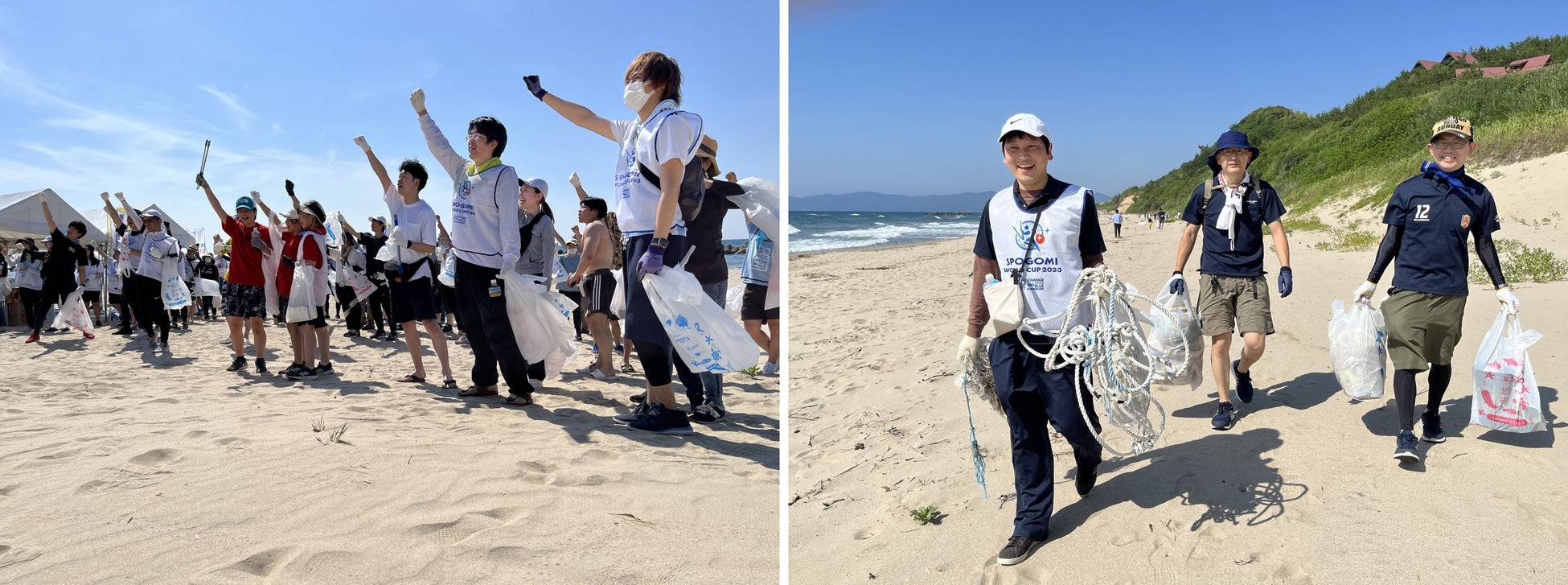 全25チームが参加した島根 STAGE。島根県内外から企業、団体、家族、友人などでチームを結成し、園児からお年寄りまで幅広い年代の方が出場しました。舞台は人気の海水浴場”キララビーチ”。当日は、真夏の暑さとなった1km以上に及ぶ海岸線で熱戦が繰り広げられました。波打ち際だけでなく、陸側の茂み、小さな川の河口、護岸ブロックの隙間など様々な場所を隈なく探し、ごみを拾い集めました。熱戦の末、優勝したのは松江市在住20代の幼馴染3人組「りくだよん。顔でかいよん。」チーム。ごみ総量40.86kg/4936.2ポイントを獲得し、準優勝チームに約2900ポイントもの大差をつけて優勝しました。2023年10月に東京で行われる予定のスポGOMI ワールドカップ 2023 日本 STAGEでも好成績が期待されます。
