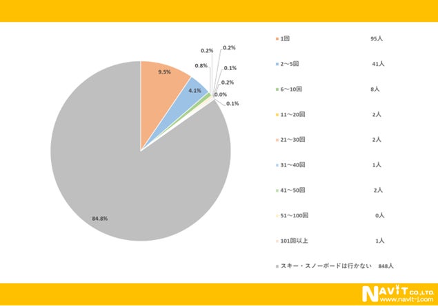 「スキー・スノーボードは年何回行きますか?」という質問については、「1回」が9.5%、「2~5回」が4.1%、「6~10回」が0.8%という順になりました。しかし、中には「101回以上」と回答された方も1人いらっしゃいました。本当に大好きな方はシーズン中毎日のように通われているのかもしれませんね。