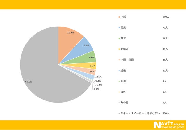 「スキー・スノーボードをやる時はどのエリアに行くことが多いですか?」という質問については、「中部」が11.9%、「関東」が7.1%、「東北」が4.9%という順になりました。
