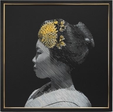 ステンシル技法を通じて、伝統と現代の感性が交差する表現を追求しています。花かんざしの繊細さは古典的な技法で、舞妓の姿は独自に進化させたステンシルで表現。紙とデザインナイフによる手作業が生む、研ぎ澄まされた美しさを大切にしています。