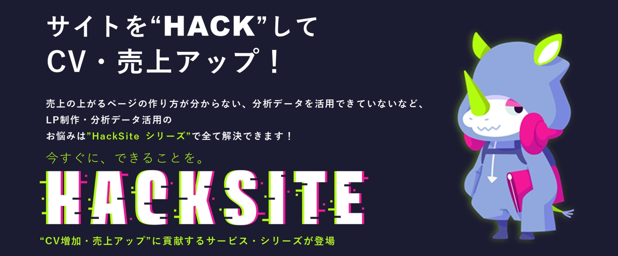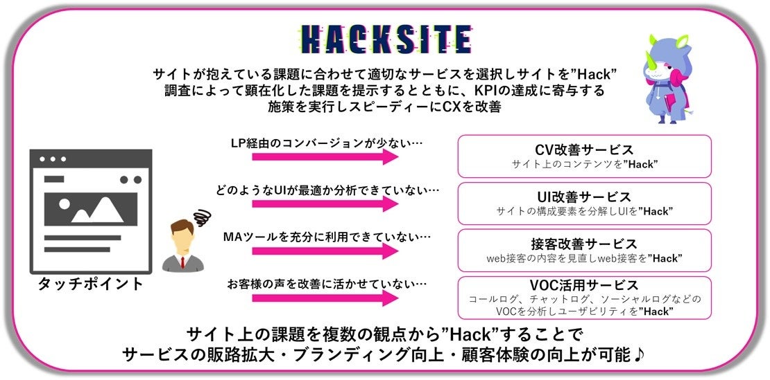 提供を開始した「HackSite」では、日々お客様企業のサイト運用を行っている経験豊富なディレクターが、お客様企業サイトが抱えている課題にあわせて適切なサービスを選択。サイトの運用状況について、定量・定性調査、コールログやチャットログ、ソーシャルログといったVOC分析を行い、施策提案などを行います。調査によって顕在化した課題を提示するとともに、KPIの達成に寄与する施策を実行しスピーディーにCXを改善します。