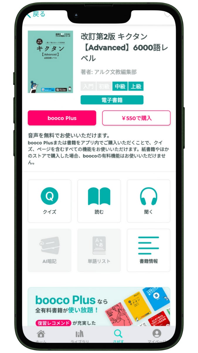 キャンペーン特別価格対象となるキクタンの2タイトル以外のアルクが出版した書籍でも、「AI暗記」などの学習機能を体験いただくことができます。アルクの書籍100タイトル以上が使い放題になる「booco Plus」プランには、「初回7日間の無料トライアル」が含まれておりますので、ぜひそちらをご活用ください。