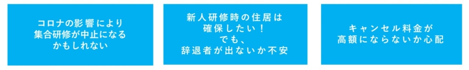 新年度、企業が本社や研修施設へ全国から新入社員を集め、集合研修を行うことがあります。その際、社員の一時的な住居を確保する必要がありますが、直前まで入社人数が確定しなかったり、立地や宿泊人数などの条件面で適切な住居が見つからないことがあり、人事担当者の負担となっています。特に現在、採用競争の高まりから内定辞退が発生したり、コロナウイルスの影響で急遽集合研修が中止になったりと、事前に住居を確保しても不要になってしまうリスクがあります。