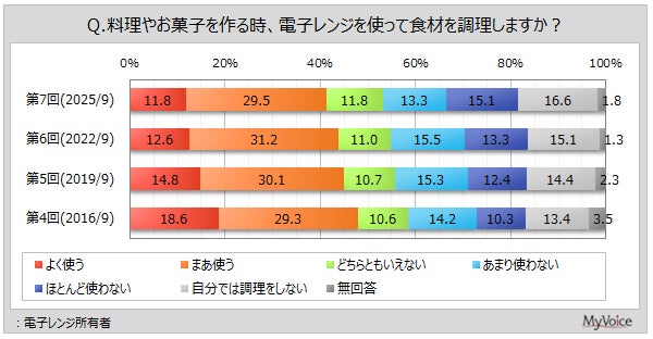 マイボイスコム株式会社(東京都千代田区、代表取締役社長:高井和久)は、7回目となる『電子レンジの利用』に関するインターネット調査を2025年9月1日~7日に実施しました。