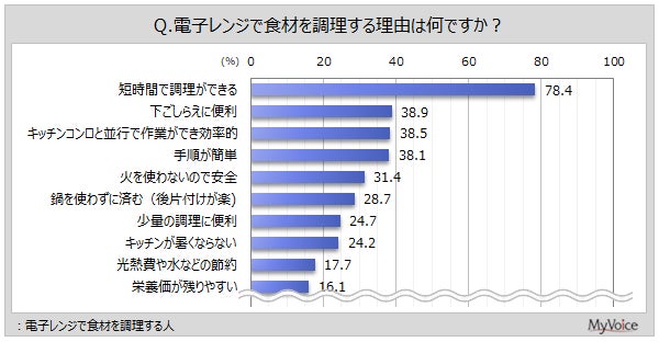 電子レンジで食材を調理する人の理由は(複数回答)、「短時間で調理ができる」が78.4%、「下ごしらえに便利」「キッチンコンロと並行で作業ができ効率的」「手順が簡単」が各4割弱です。