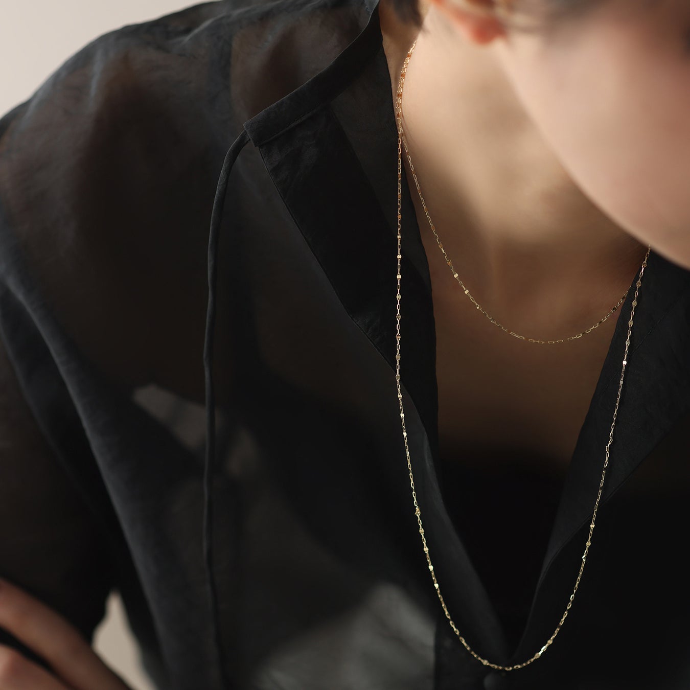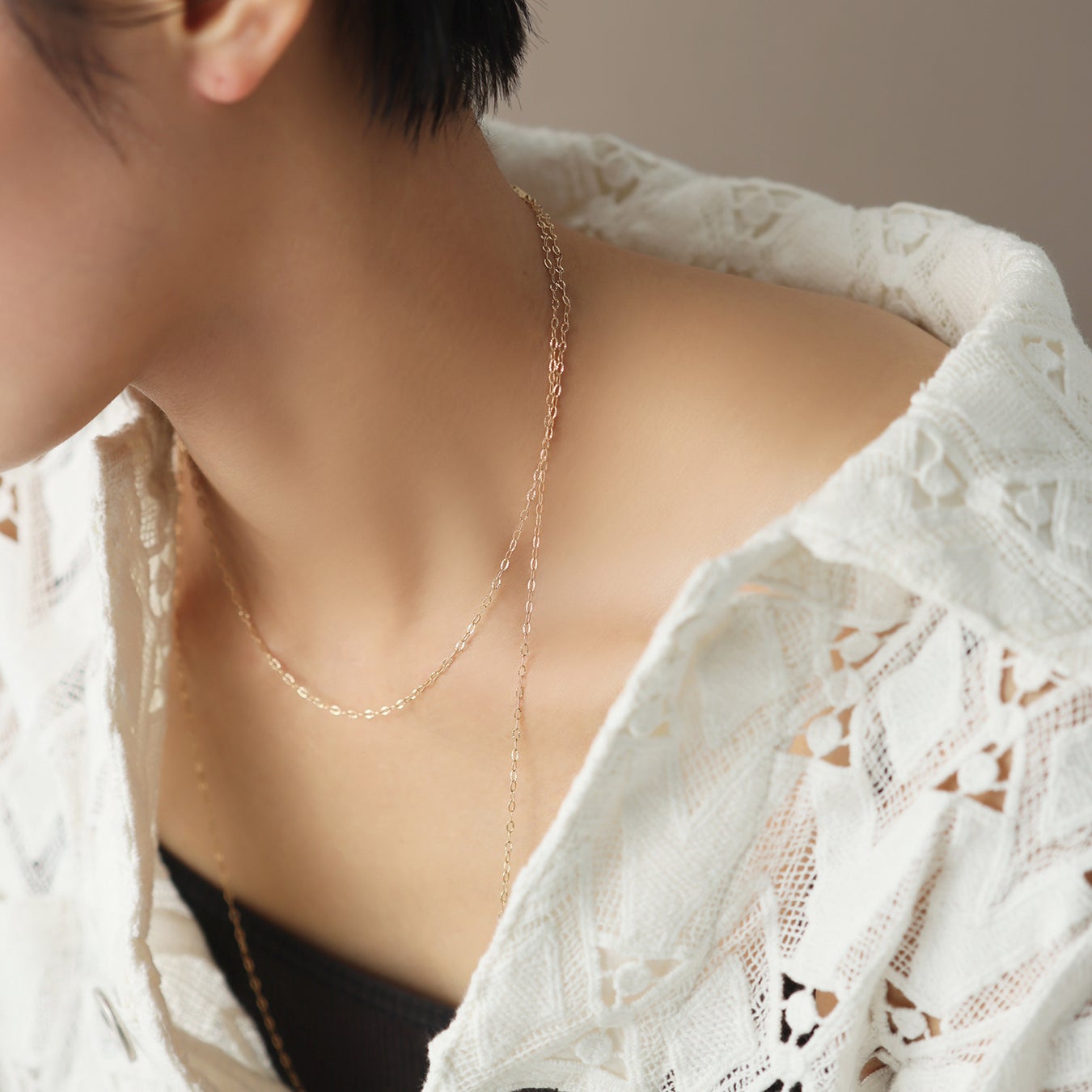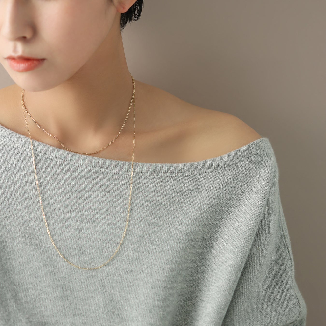 どちらもさまざまなアレンジを楽しめる仕様に仕立てているため、コーデは気分に合わせて、ネックレスの形を変化させて。
