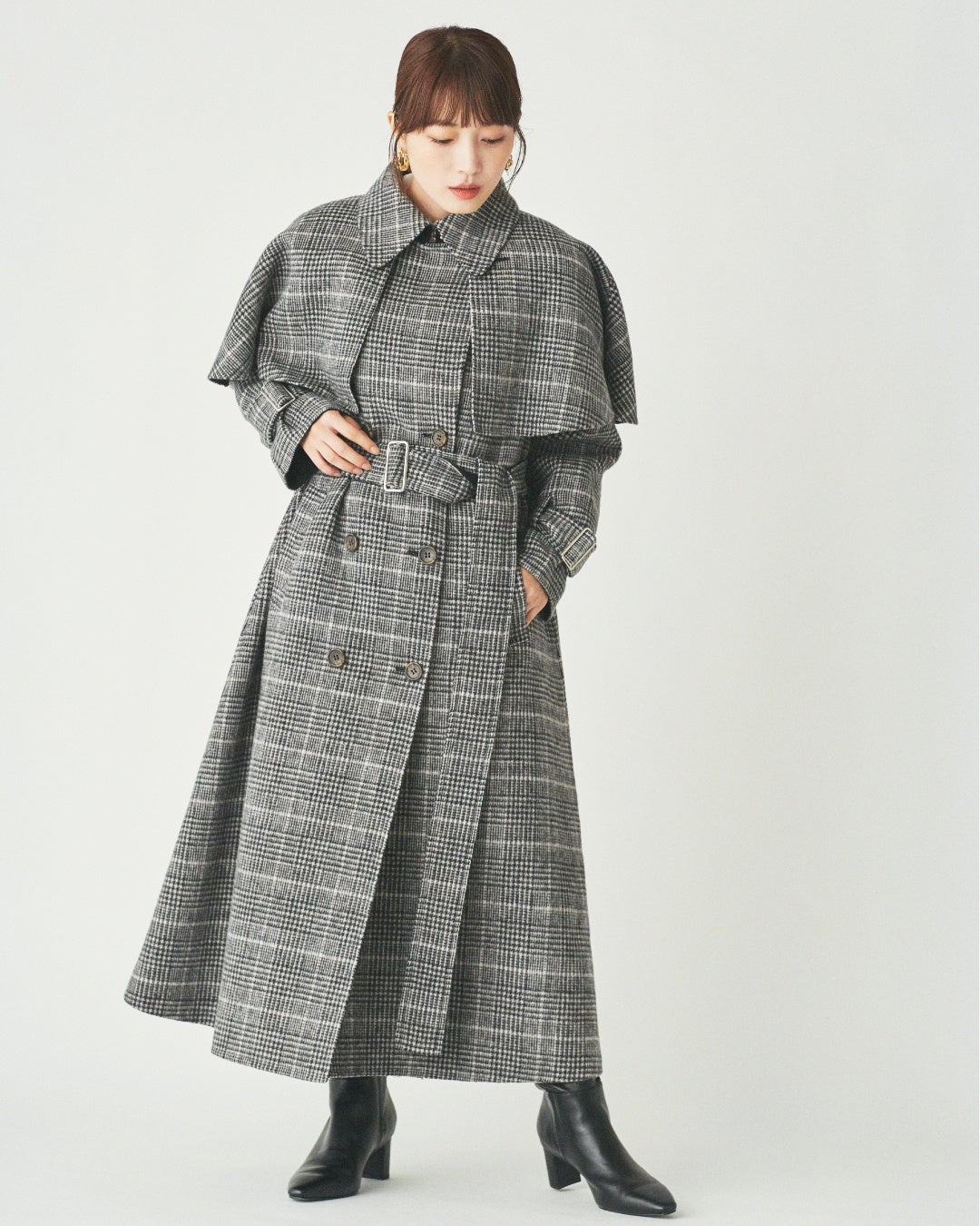 人気のケープコートは骨格ナチュラルの気になる肩周りをカバーしてスタイルよく見せてくれるアイテムです。ウエストを絞りすぎずにマークする太めのベルトが好相性。厚手のロングコートもスッキリ着こなせるのは骨格ナチュラルならでは。大きめのチェック柄も骨格ナチュラルの得意なアイテムの1つ。低身長さんはボリュームコートを着用する際に、足元をコンパクトにするのが好バランス。