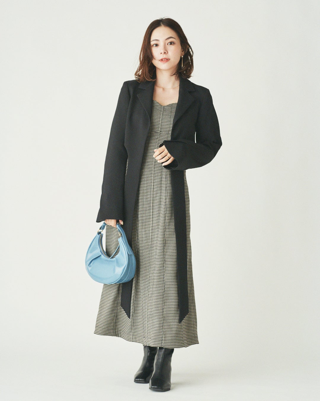 体の凹凸に合わせた立体的なワンピースは、骨格ストレートの得意なアイテム。ワンピースの絶妙に開いたデコルテラインとジャケットのテーラード襟の縦ラインで、胸元がスッキリ見えます。また、短丈のジャケットは低身長さんでもバランス良く着こなせます。ジャケットの裾の変形デザインで縦ラインを作り、華奢に見せる効果をプラス。レザーのバッグとシンプルなスクエアショートブーツと合わせてキレイめに仕上げています。