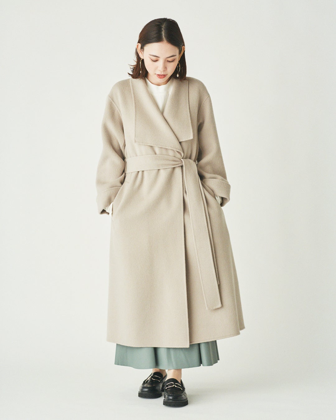 骨格ストレートは低身長の方でもロングコートを着用する際に、縦ラインを演出するのがポイント。ジャストウエストでベルトマークをすることでスタイルアップが実現し、デコルテを見せて凹凸のない素材を選べば、着膨れしません。