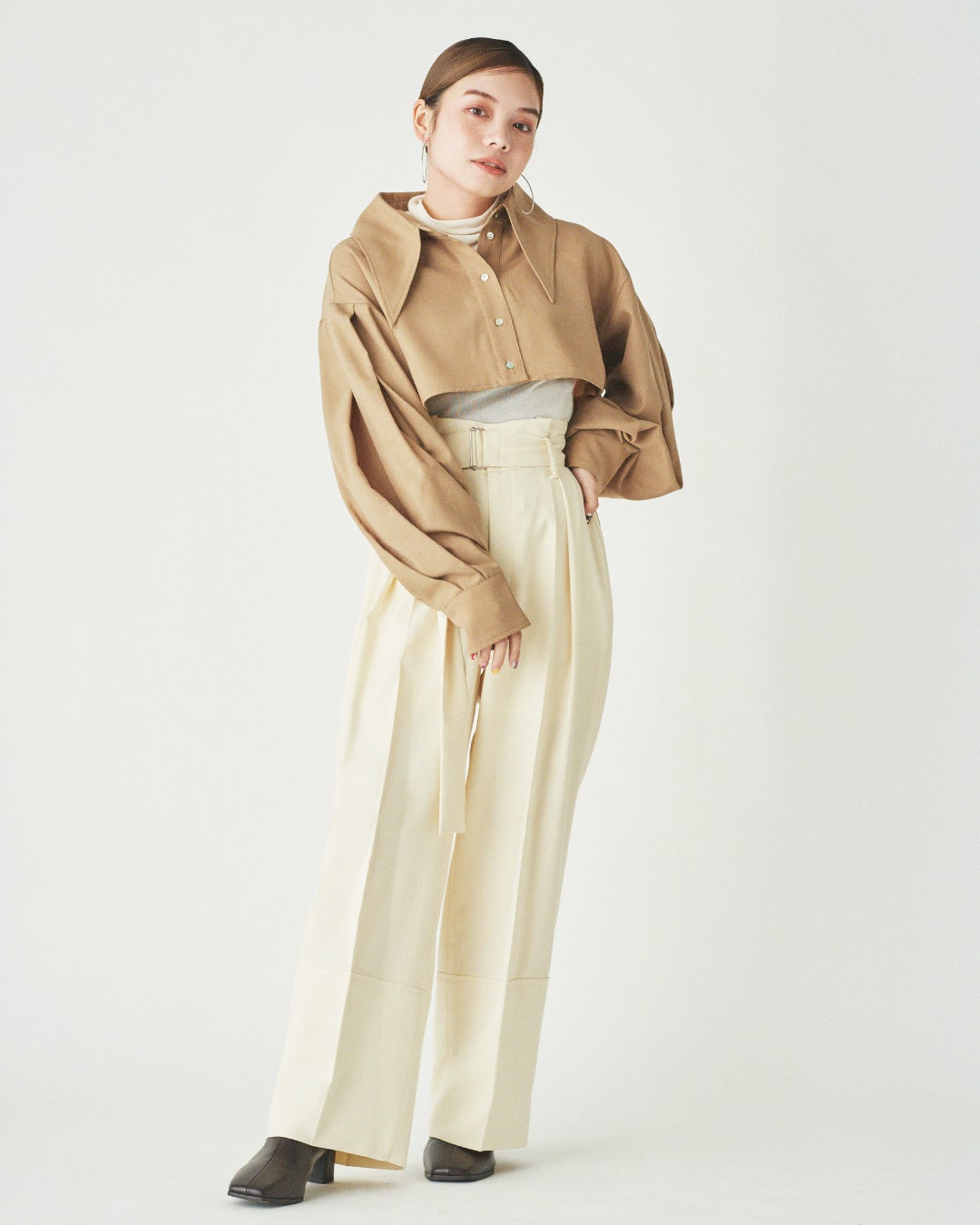 ワイドシルエットを選ぶときには、ウエストをフィットさせると下半身にボリュームが出ずに本来のスタイルを活かせます。低身長さんは、ワイドボトム着用時は、ヘアスタイルもタイトにまとめるのがおすすめです。
