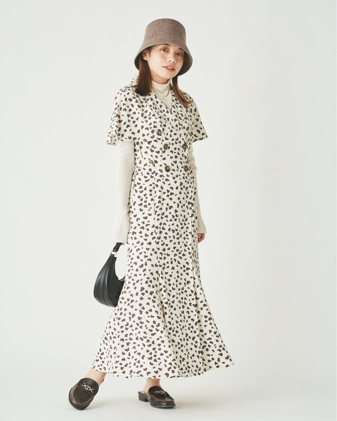 細かい柄が得意な骨格ウェーブでも、可愛くなりすぎない豹柄で大人っぽくスタイリング。トレンチデザインのワンピースは胸元の開きを浅くするとバランス良く着こなせます。トレンドのシースルーインナーを合わせていコーディネートに仕上げました。ハイウエストできゅっとマークしたワンピースは低身長でも脚長効果が出やすいアイテム。目線を上げるポイントとして、柔らかい素材のバケットハットを合わせました。足元はコンパクトにまとめるのがおすすめ。