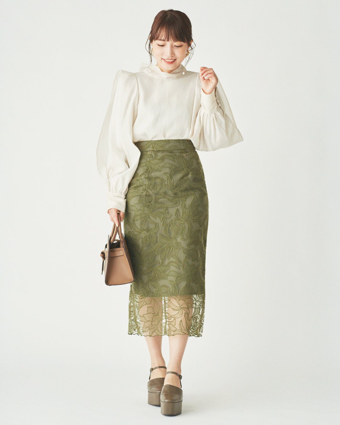 フェミニンなタイトレーススカートを骨格ナチュラルが選ぶ時には、レースに凹凸があるものがおすすめ。膝までインナーで隠れる丈であれば透け感は気になりません。ブラウスはウエスト部分を腰の横幅と合わせるとフレームを拾わずにスッキリ見せが叶います。袖の縦ラインのシルエットがスタイルアップのポイントに。ボトムがコンパクトな分、足元や小物でボリュームをプラスしてバランスを取ると、華やかさもプラスされた言葉が完成します。