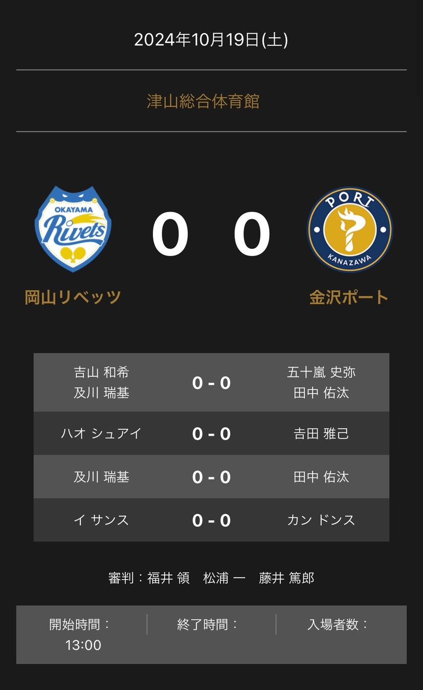 ノジマTリーグ 2024-2025シーズン 公式戦 10月19日開催 岡山リベッツ vs 金沢ポート 対戦オーダー発表