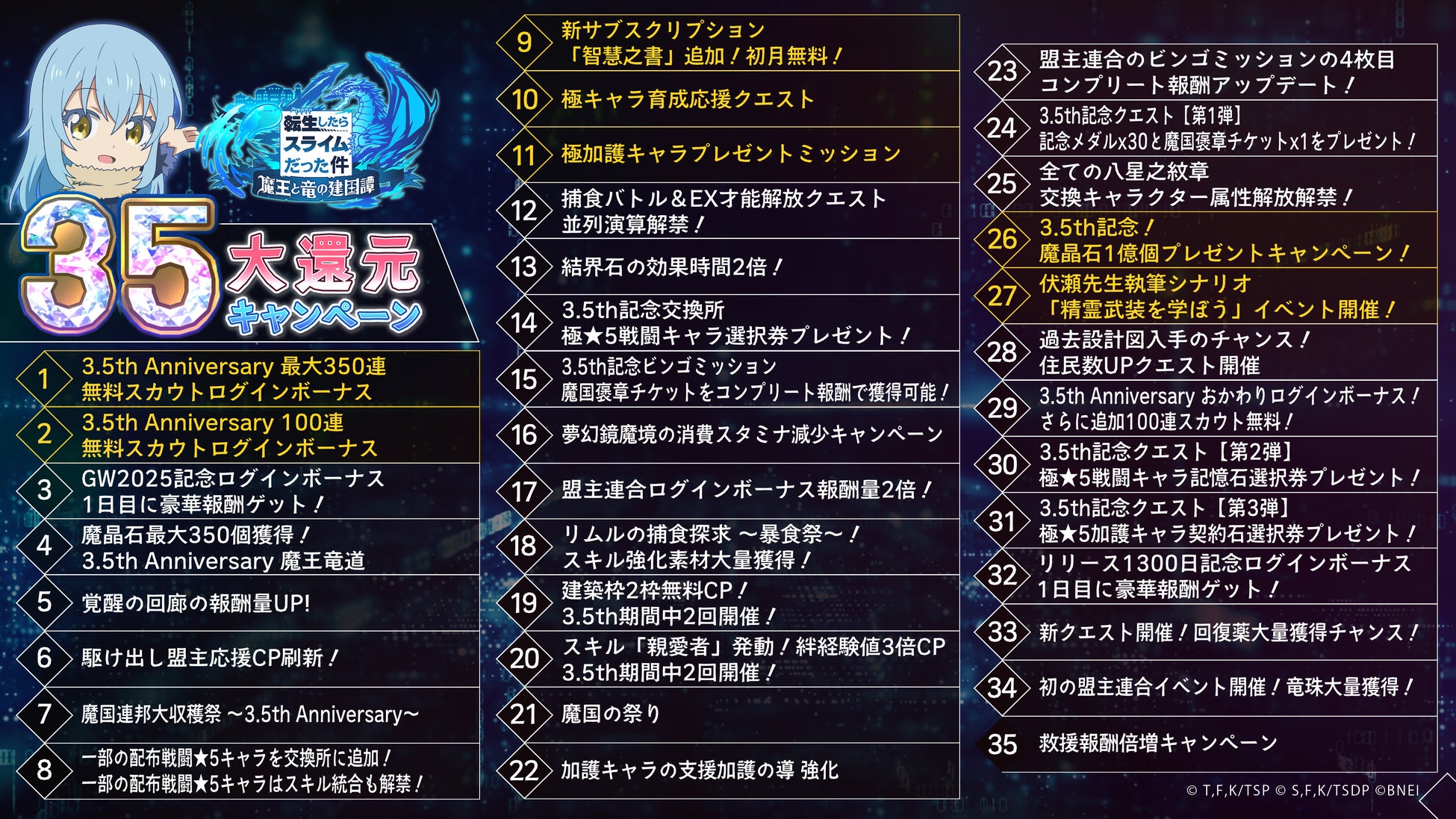 株式会社バンダイナムコエンターテインメントより配信している『転生したらスライムだった件 魔王と竜の建国譚』は、本日3.5周年を迎えました。これを記念して、35大還元キャンペーンを開催します