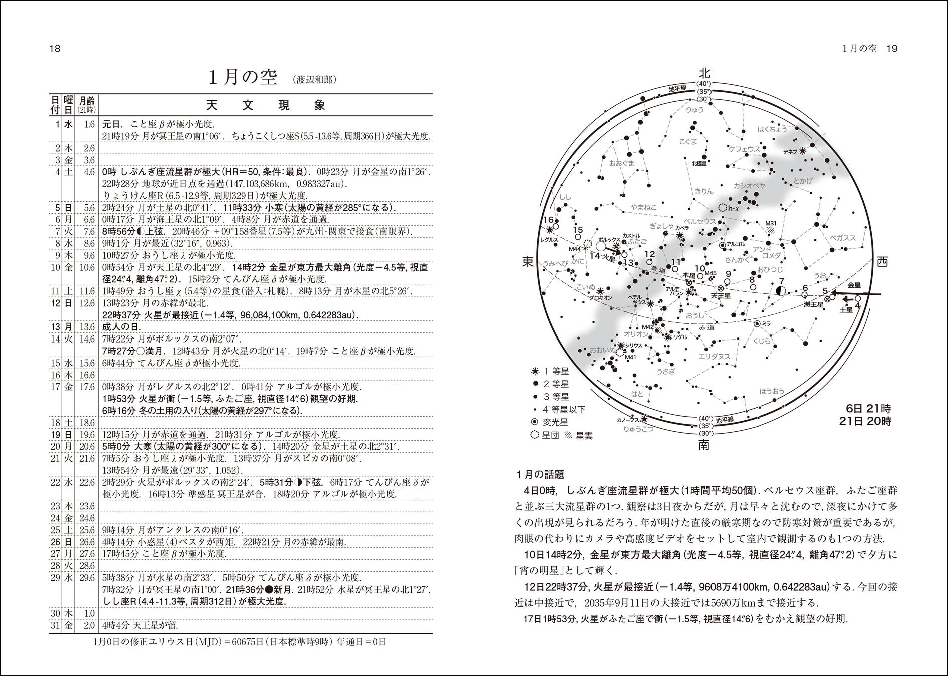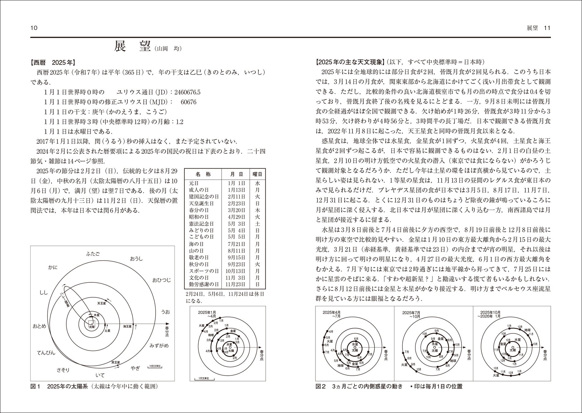 天文年鑑2025年版は、2025年に起こる天文現象の予報と解説(全国8都市における日の出入り・月の出入りの時刻や月の出・月の入りの時刻をはじめ、毎月(12ヵ月)の星空、日食や月食などの食現象、各惑星の動き、準惑星や小惑星の動き、彗星の出現予報、流星群の予報など)や、2023年夏~2024年夏に起こった天文現象の観測結果を収録しています。