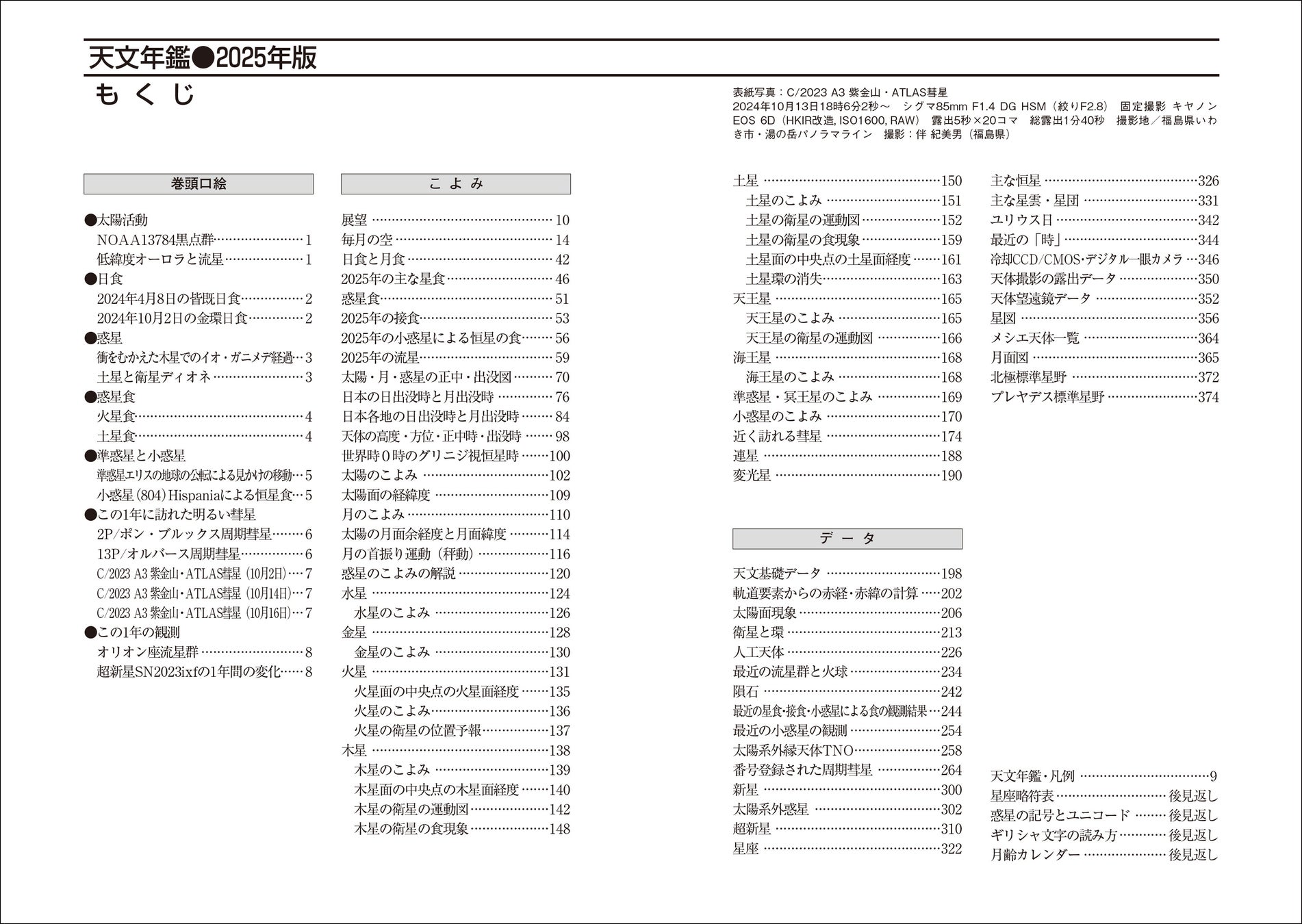 2025年版の巻頭口絵では、2024年10月に久しぶりの肉眼彗星が出現して話題となった「紫金山・アトラス彗星(C/2023 A3)」の見応えのある姿やその変化の様子をはじめ、日本国内で3回出現した低緯度オーロラの様子、流星群の様子や惑星食をとらえた貴重な画像を掲載しています。