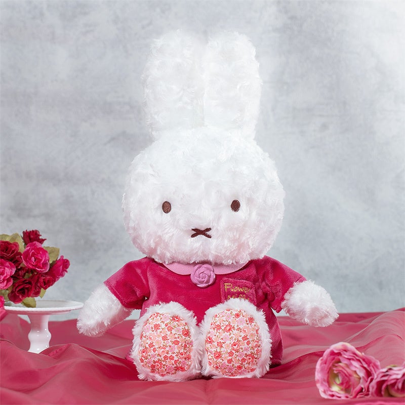 足裏にあしらわれたローズの小花柄はそのままに、抱っこするのにちょうどいいサイズ感になったフラワーミッフィーオリジナルのぬいぐるみです。ローズをイメージした深みのあるバイオレットカラーのお洋服を着用しており、襟元にはローズモチーフのボタン、胸ポケットの部分には「Flower Miffy」の刺しゅうが施されており、高級感を感じるクラシカルなデザインになっています。