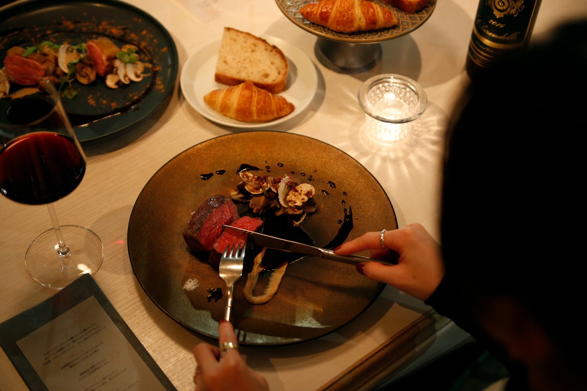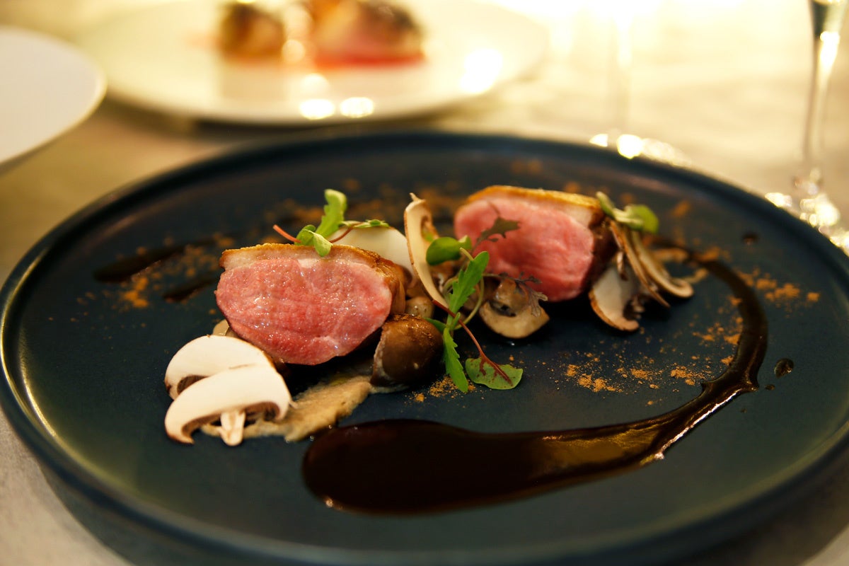 〇黒毛和牛のロースト 六甲シャンピニオンと旬のキノコ 赤ワインソース