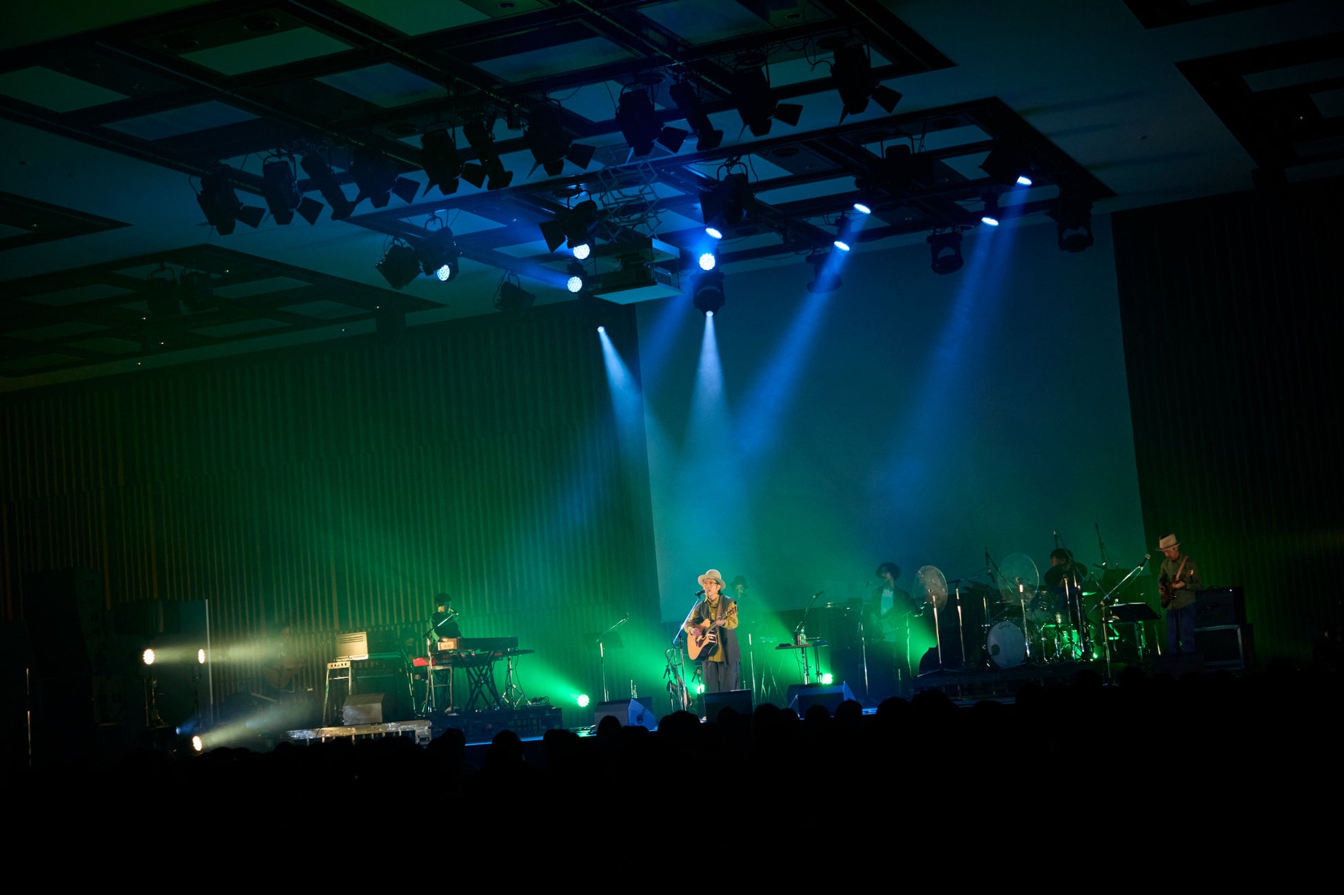 たった1曲でハナレグミのフィールドに誘うと、「チキンカチャトラ」をすかさず投下。自然発生するクラップ、今まで座っていたオーディエンスは音に誘われるように立ち始める。ソウルフルに歌う永積に呼応するオーディエンスはクラップを止めることはない、そんな多幸空間の中で、永積は口を開く。「自分の曲は景色を歌うことが多い。次の曲もみなさんの景色と交われたらいいな」と始まった「家族の風景」。オレンジの灯りに染まったステージの上で優しく語りかけるように彼は歌う。会場にいるオーディエンスの脳裏にはどんな景色が浮かんだだろうか、温かく、それでいて優しい音色、その中心には永積の歌声がある。まるで歌っているような石井のギターと透き通る風のように奏でるYOSSYの鍵盤、聴いているだけで心が浄化されてしまいそうな楽曲を歌い上げると、「ビッグスマイルズ」を披露。曲が展開するたびに広がっていく音の葉、そして一聴するだけで夏の入口の季節を想起させる秀逸なリリックは優しく我々に寄り添う。