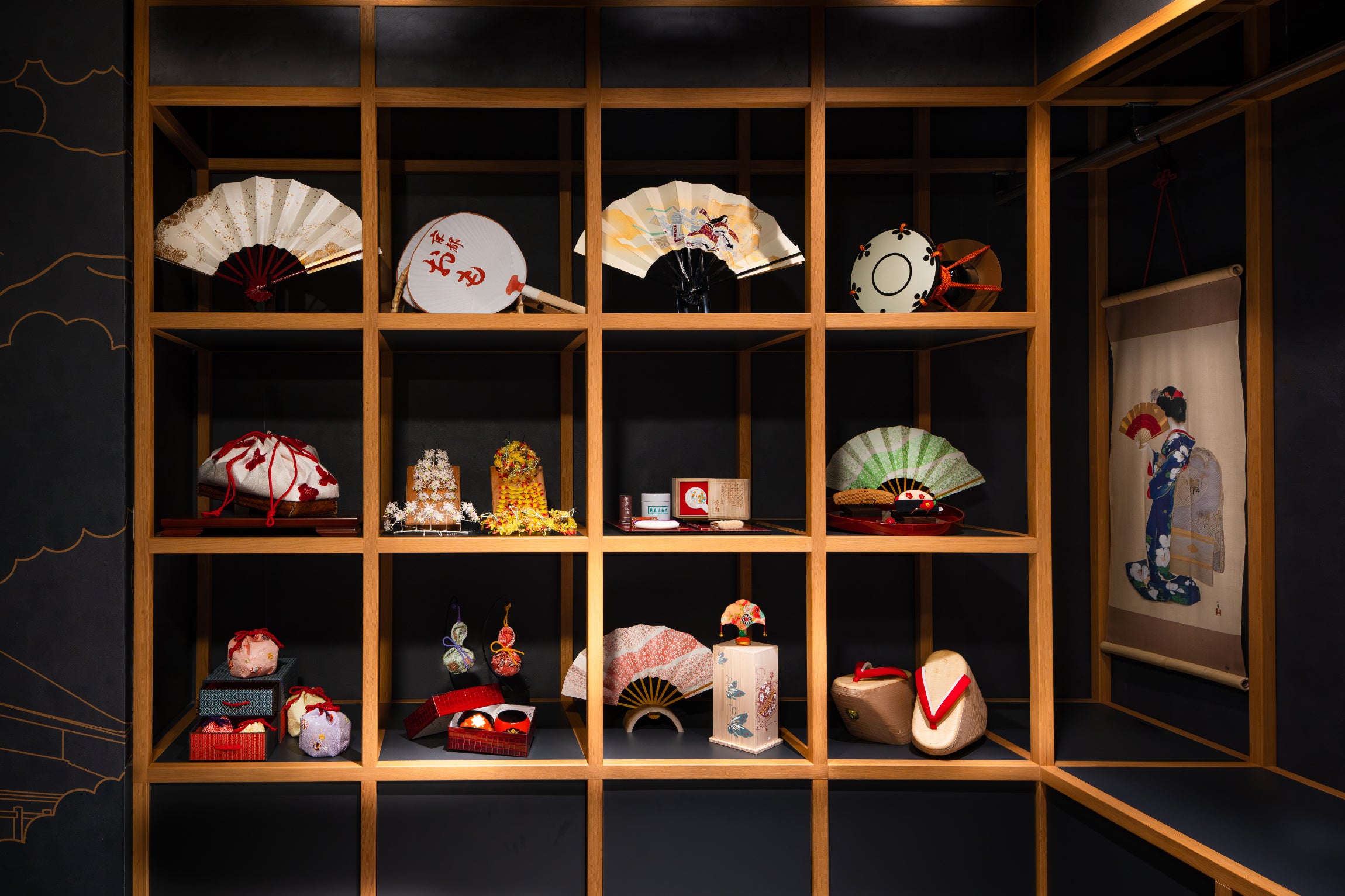 装飾は祇園の花街の華やかさをイメージし、江戸時代創業の老舗「小嶋商店」の提灯と床一面の畳をOMOベースに設え、夜のお座敷を演出します。また、舞妓さんが日頃から身に着けるかんざしや京舞扇子などの工芸品を展示し、職人の細やかな技や、芸舞妓の暮らしの独自のしきたりなどを紹介します。