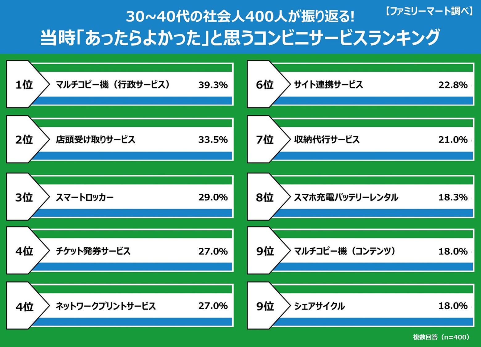 株式会社ファミリーマート(本社:東京都港区、代表取締役社長:細見研介)は、継続して取り組んでいる5つのキーワードの1つである「『あなた』のうれしい」の一環として、マルチコピー機による行政の各種証明書の取得サービスや店頭受け取りサービスなど様々なサービスを提供しております。このたび、30~40代の社会人男女400人を対象に、「若手時代のヒヤッとエピソード」と「当時あったらよかったコンビニサービス」に関する調査を実施しました。