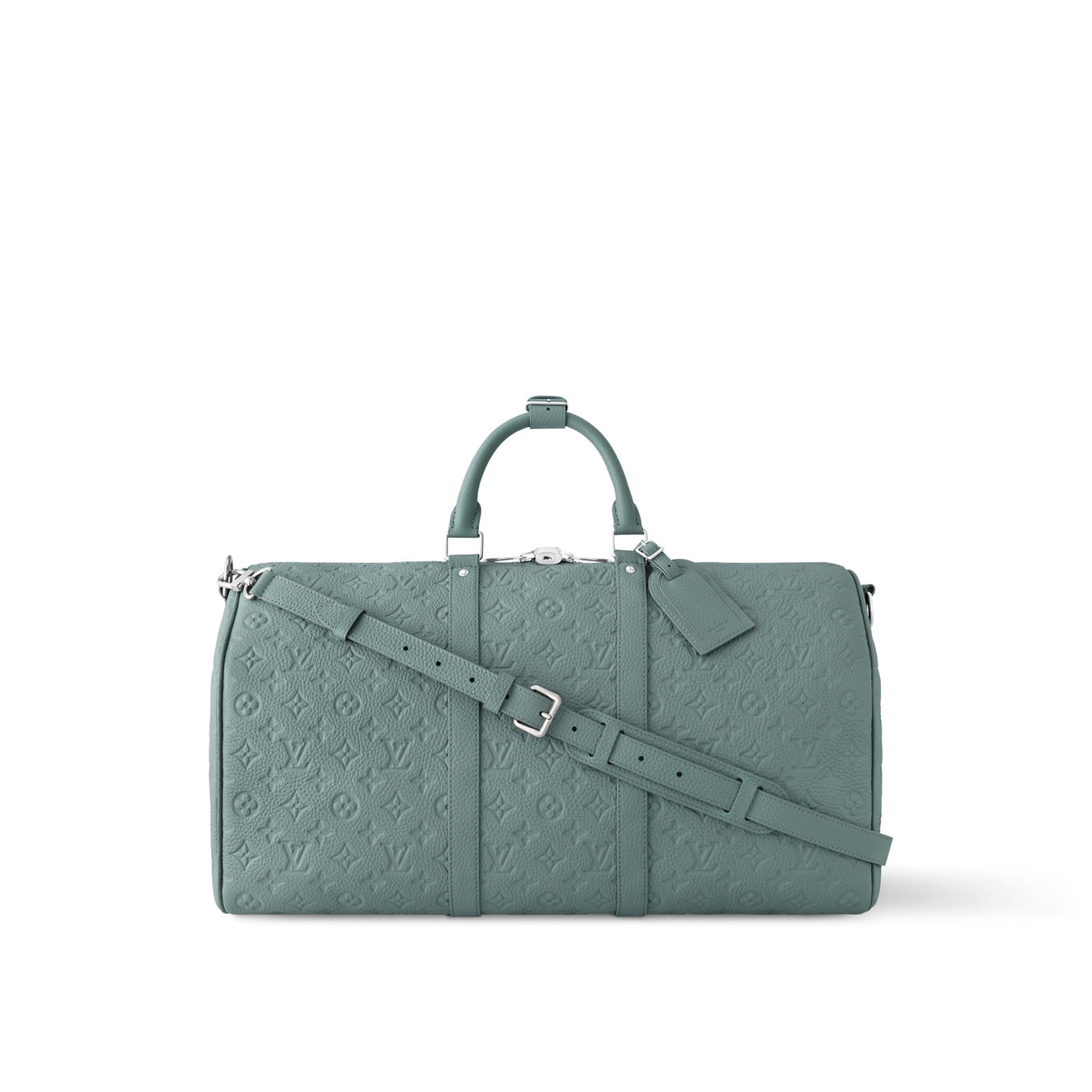 「キーポル·バンドリエール 50」は、ファレル·ウィリアムスがイタリア人画家 ジョルジョ·モランディのパレットから着想を得た柔らかな色合いを取入れ、アンティーク調のシルバーカラーの金具やコットンライニングと組み合わせました。さまざまな持ち方を楽しめる2本のロール仕上げのレザートップハンドルと取外し & 調節可能なストラップ付き。