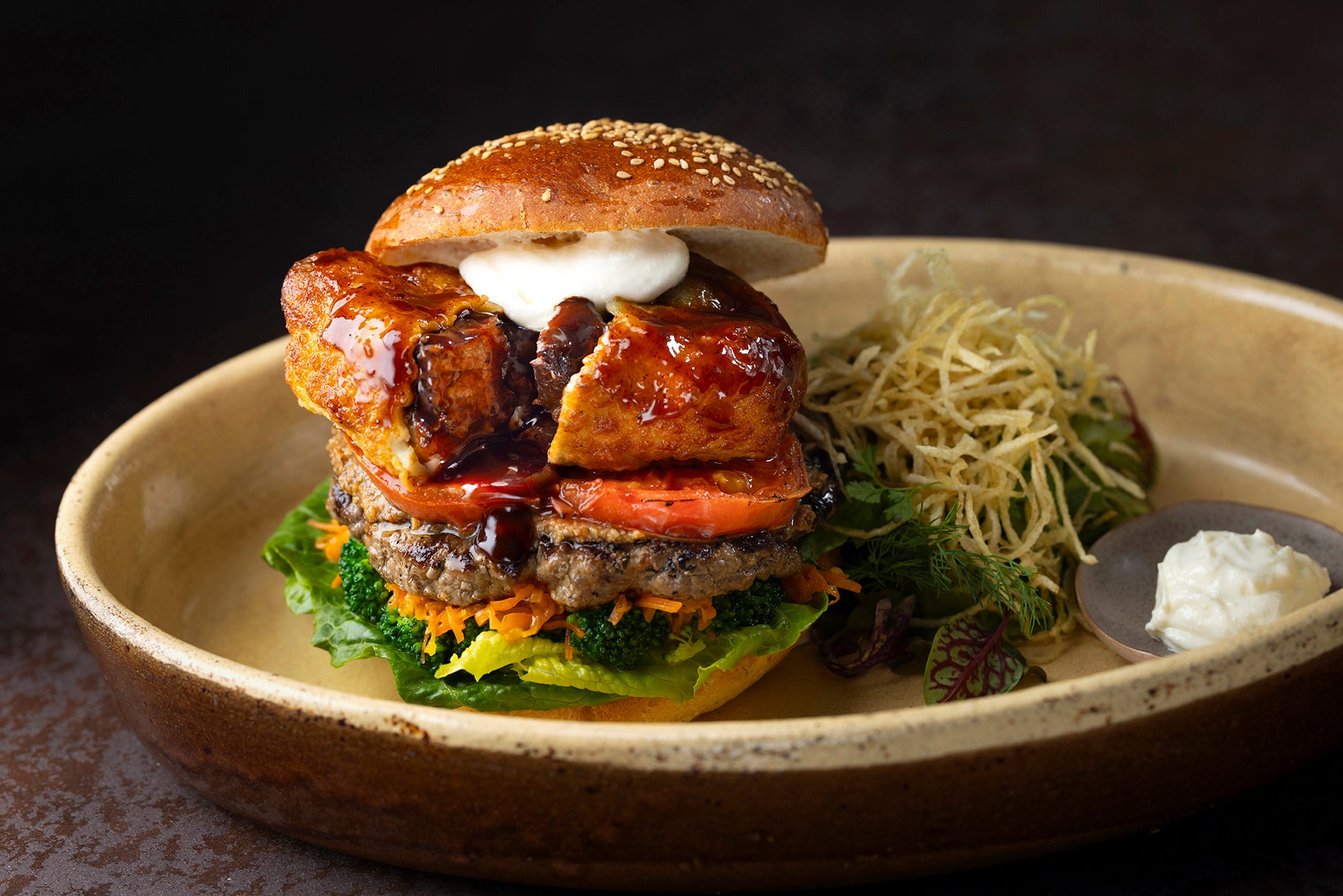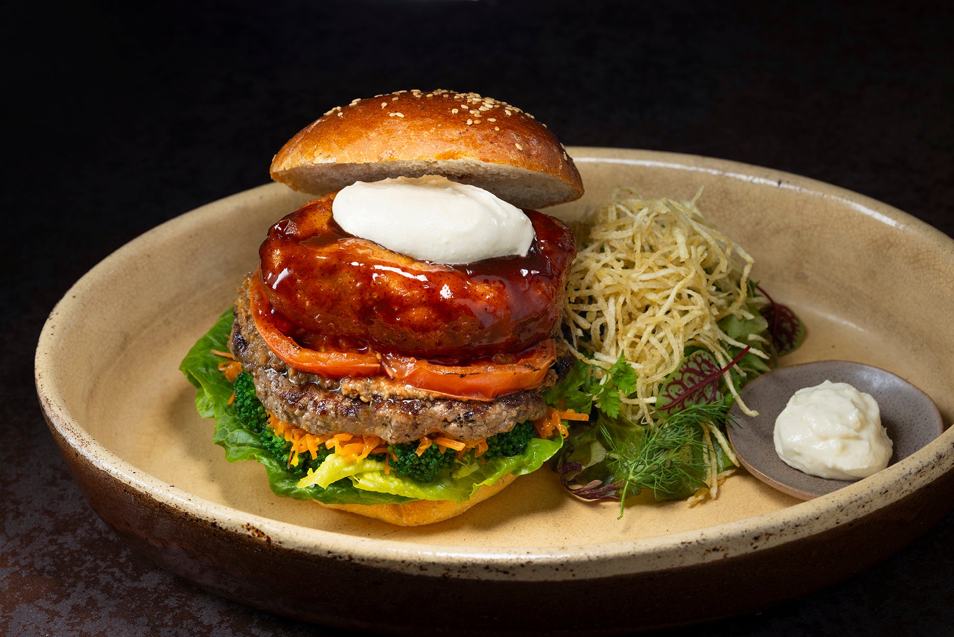 また、通常はソースとともに煮込む野菜も工夫いたしました。にんじんはラペに、マッシュルームは細かく刻んでバターで炒めたデュクセルに、ブロッコリーは塩ゆでにし、それぞれの旨みを引き出しています。この他にもグリルトマトやロメインレタスも具材としてご用意し、国産牛100%のビーフパティとともに重ね、最後にサワークリームものせてご提供いたします。頬張って全ての具材が一緒になると、濃厚な旨みに爽やかな酸味が加わり、ビーフシチューの味わいを存分に楽しめます。