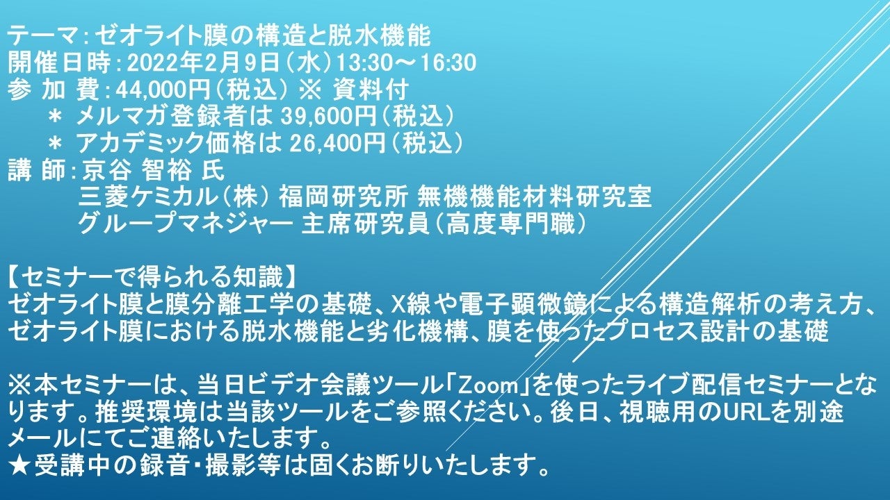 先端技術情報や市場情報を提供している(株)シーエムシー・リサーチ(千代田区神田錦町: https://cmcre.com/ )では、 各種材料・化学品などの市場動向・技術動向のセミナーや書籍発行を行っておりますが、 このたび「ゼオライト膜の構造と脱水機能」と題するセミナーを、 講師に京谷 智裕 氏 三菱ケミカル(株) 福岡研究所 無機機能材料研究室 グループマネジャー 主席研究員(高度専門職))をお迎えし、2022年2月9日(水)13:30より、 ZOOMを利用したライブ配信で開催いたします。 受講料は、 一般:44,000円(税込)、 弊社メルマガ会員:39,600円(税込)、 アカデミック価格は26,400円(税込)となっております(資料付)。