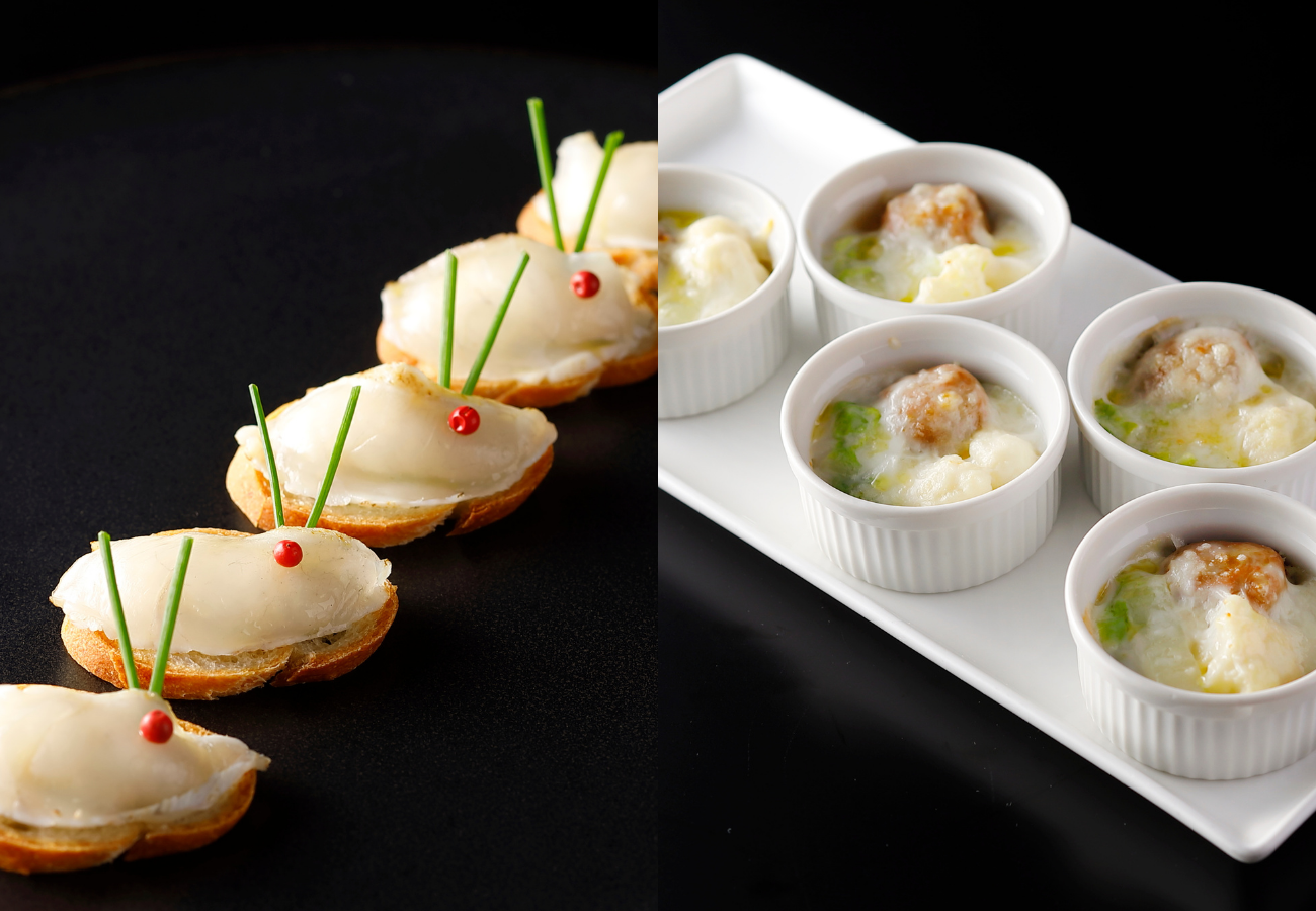 音柱、宇髄天元の好物である「ふぐ」を使用したタパス。炙ったふぐ刺しに、ブランダードを詰め、音柱をイメージして盛り付けました。