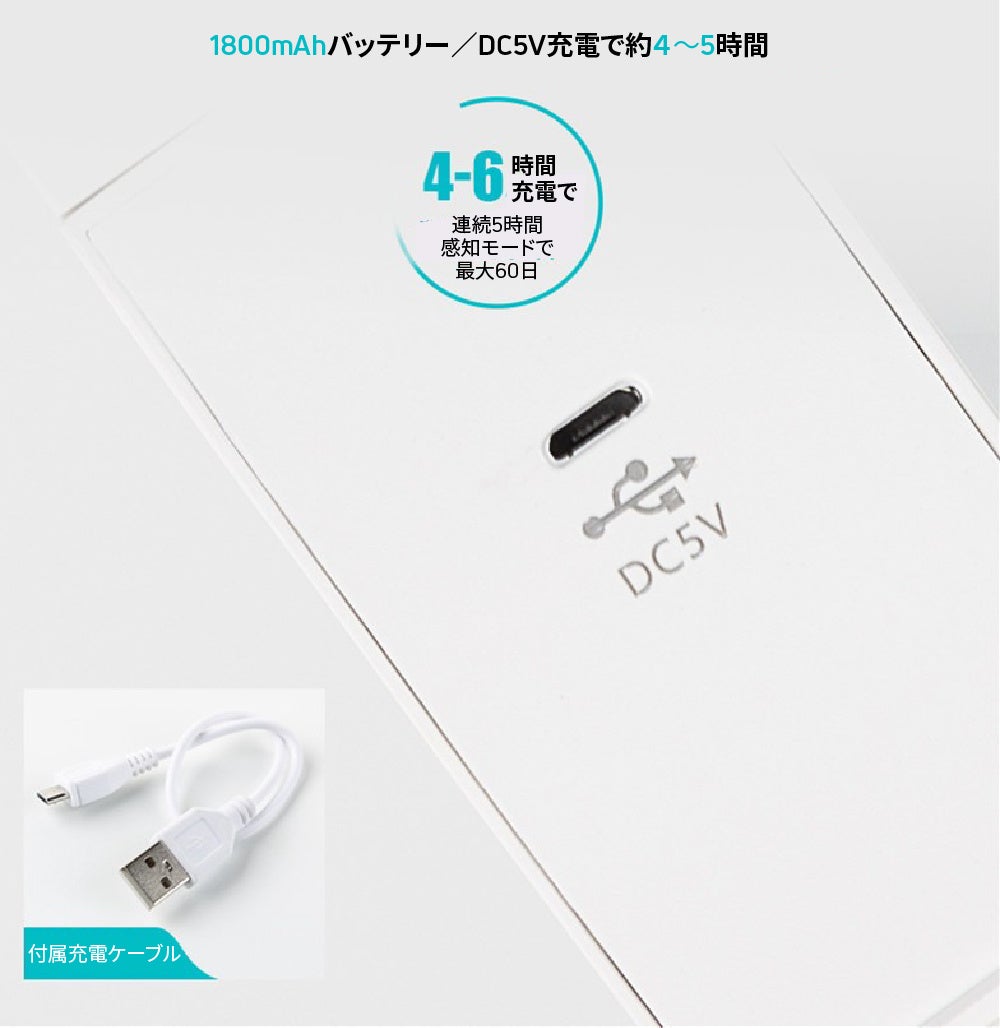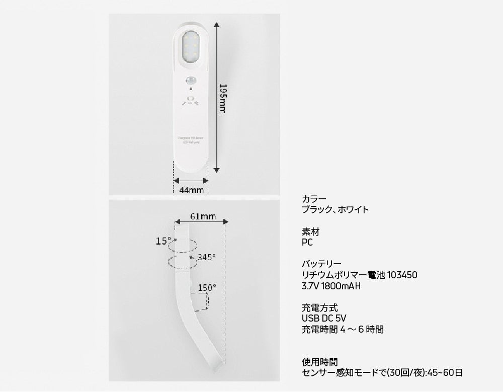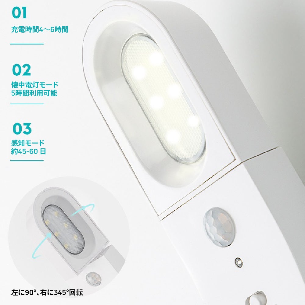 - 長時間使えるバッテリー搭載。センサー感知モードで最大60日、懐中電灯として約5時間点灯