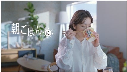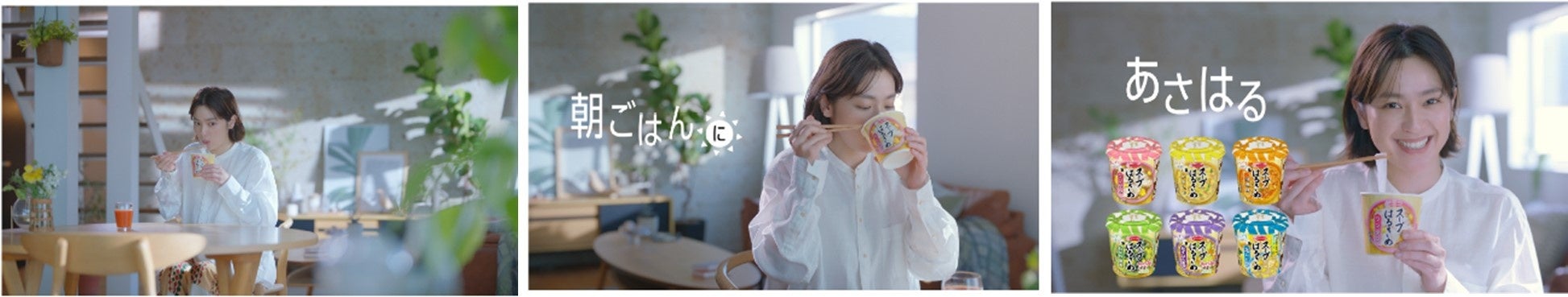 「あさはる」篇では、朝の光に包まれる中、スープはるさめにお湯を注ぐシーンから始まり、朝ごはんにスープはるさめを食べる、中村アンさんの自然な表情と、実はスープはるさめが朝ごはんにちょうどいい事をおススメする、ストーリーになっています。