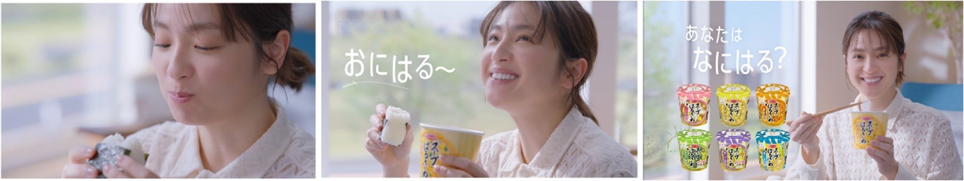 「おにはる」篇では、スープはるさめと相性抜群のおにぎりを食べて、満足げにほほ笑む中村アンさんの表情と、様々な組み合わせにちょうどいいスープはるさめを「あなはた、なにはる?」と投げかけるかたちで表現しています。