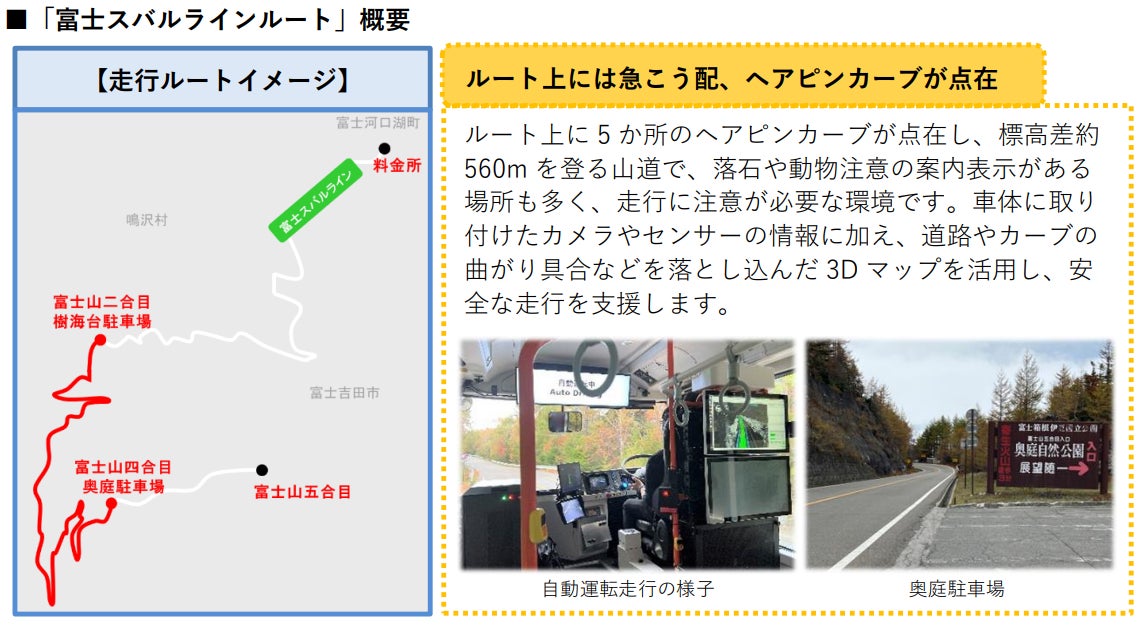 山梨県富士吉田市(市長:堀内茂)、富士急行株式会社(山梨県富士吉田市、取締役社長:堀内光一郎)、富士急バス株式会社(山梨県南都留郡富士河口湖町、取締役社長:古屋毅)、BOLDLY株式会社(東京都港区、代表取締役社長 兼 CEO:佐治友基)は、持続可能な地域公共交通の実現を目指し、2024年11月10日(日)から自動運転EVバス運行の実証実験第2弾(以下「本実証」)を実施します。今回は2023年度実証を踏まえ、富士吉田市内の公道「富士みち」を中心とした市内を循環するルートに、富士山の麓から五合目を結ぶ自動車道「富士スバルライン」ルートを新たに加えた2つの走行ルートで実証を行います。