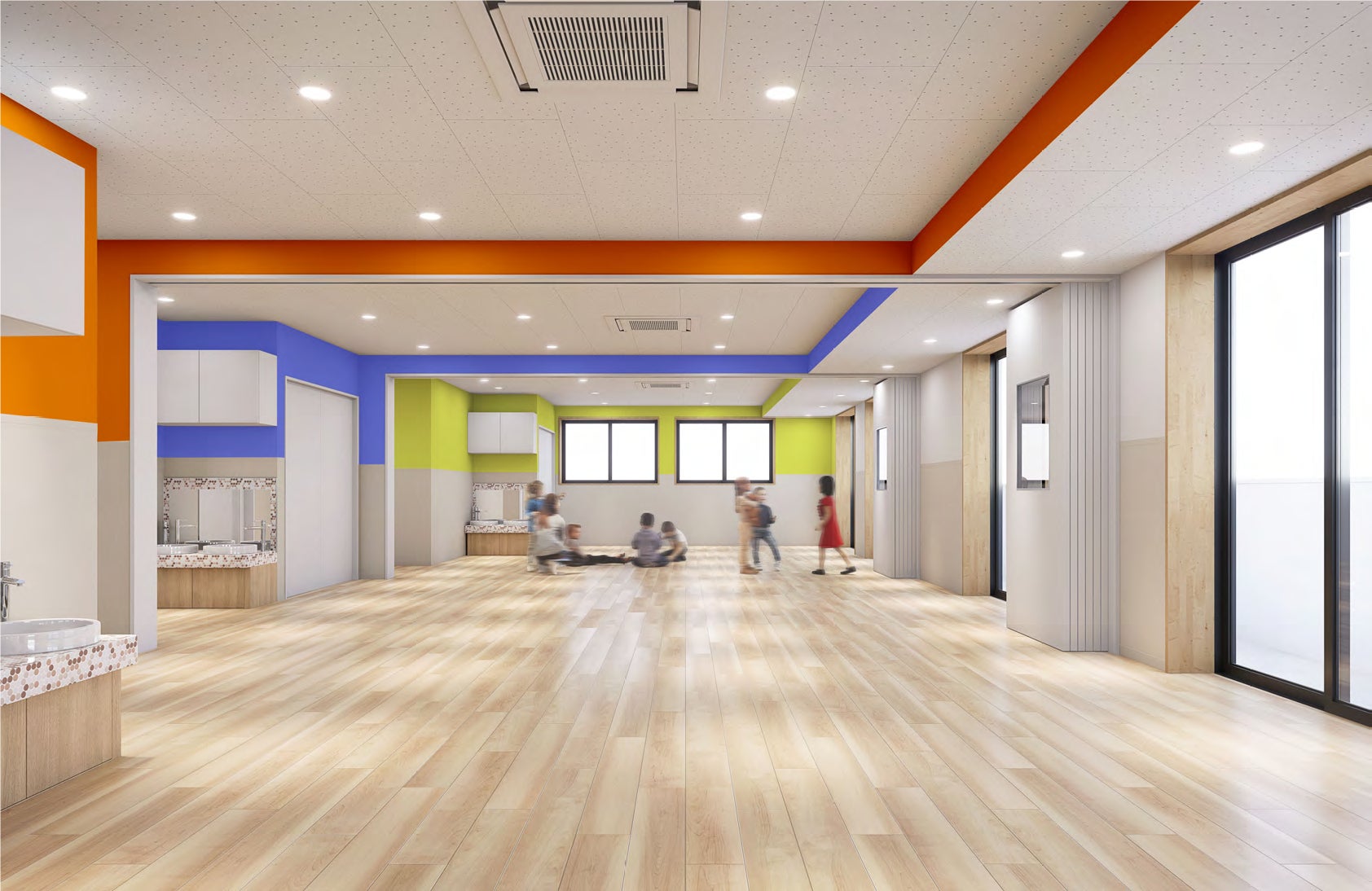 【デザインポイント】空間の特性を活かし各エリア毎に彩度の高いカラーで色分けすることで中に入った瞬間に絵本の町に飛び込んだような空間を創出します。空間ごとに異なるストーリーが展開され、各エリアで子どもたちの気持ちや行動に自然な変化を促します。保育園全体が「絵本のページのように色鮮やかに展開する家」であり、子どもたちが色に導かれながら、冒険心や好奇心、そして毎日来たくなるようなワクワク空間をめざします。