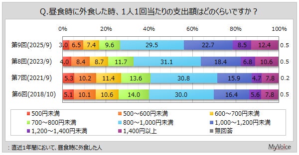 過去調査と比べて昼食・夕食ともに支出額の増加が見られますが、昼食は2021年調査以降1,000円以上の比率が大きく増加しています。