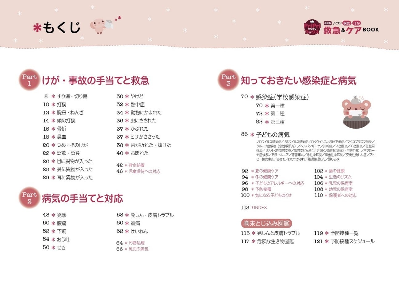 本書には、すり傷・切り傷、打撲や骨折などのけがだけでなく、発熱やけいれん、子どもがかかりやすい感染症など、あらゆるけがや病気に対応しています。