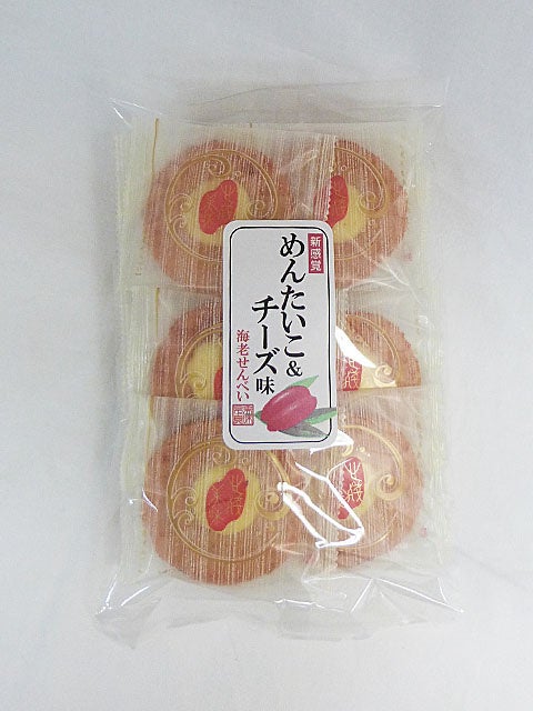 めんたいこが付いた海老せんべいの生地に、チーズをたっぷりトッピングしました。1度に3種類の味が楽しめる嬉しいお菓子です。