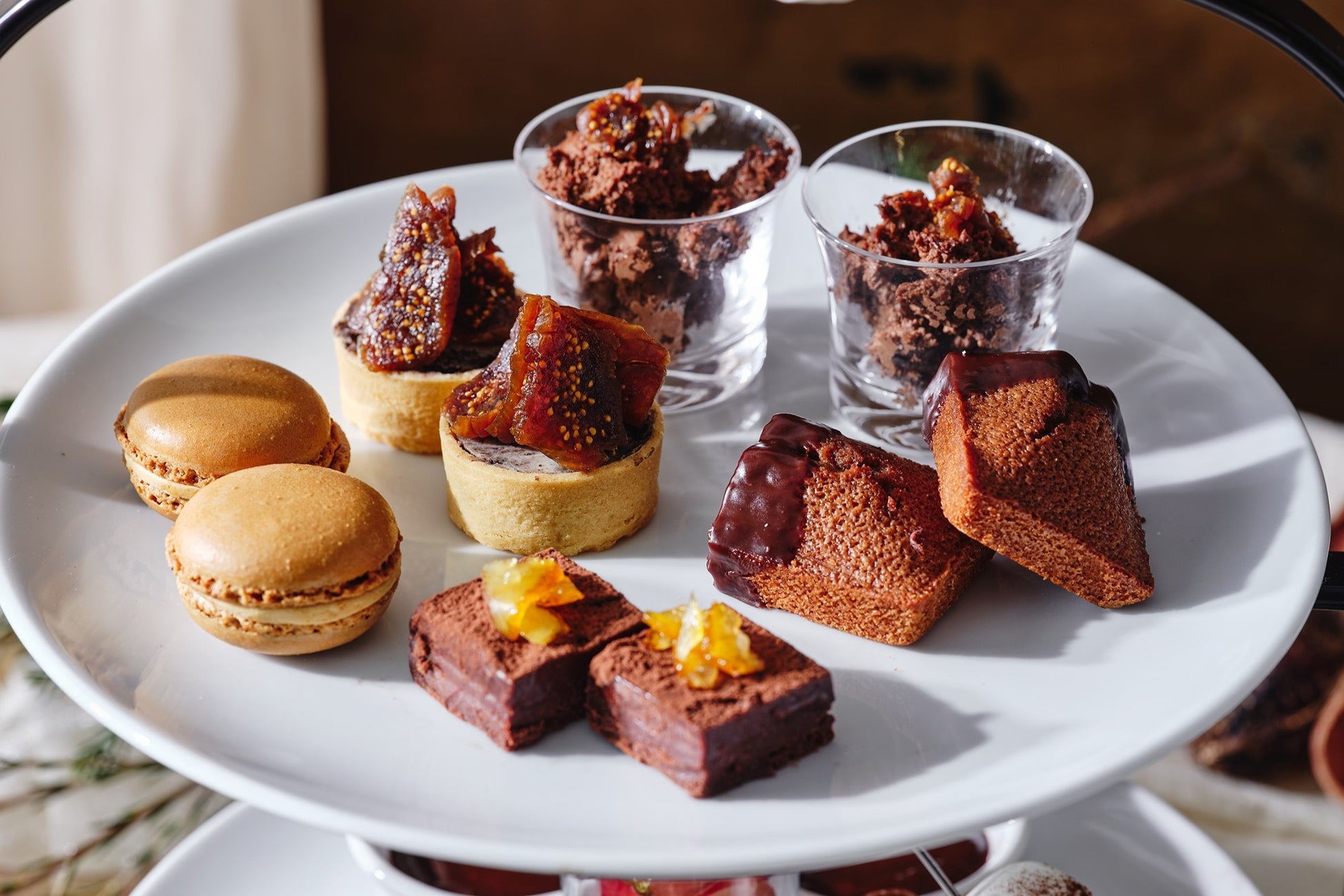 上段にはショコラマカロンとフィナンシェ、セミドライのいちじくを乗せたココアとクリームチーズのタルト、ショコラムースや、オレンジピールがアクセントになったほろ苦い生チョコなど、チョコレートづくしのラインナップが揃います。