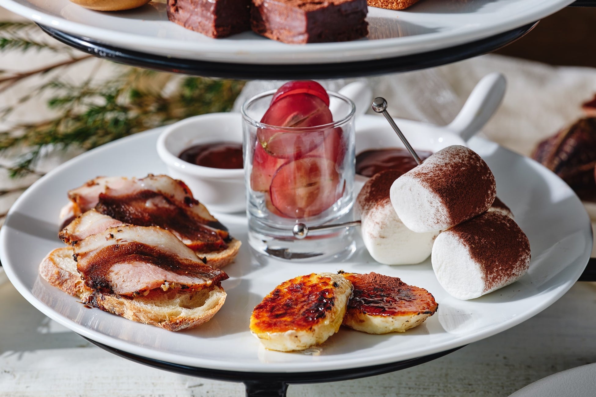 また下段のセイボリーには、ショコラバルサミコソースで仕上げた合鴨のカナッペのほか、ぶどう、マシュマロやキャラメリゼしたバナナをスイートチョコレートにディップしてお召し上がりいただく、プチチョコレートフォンデュをご用意しました!