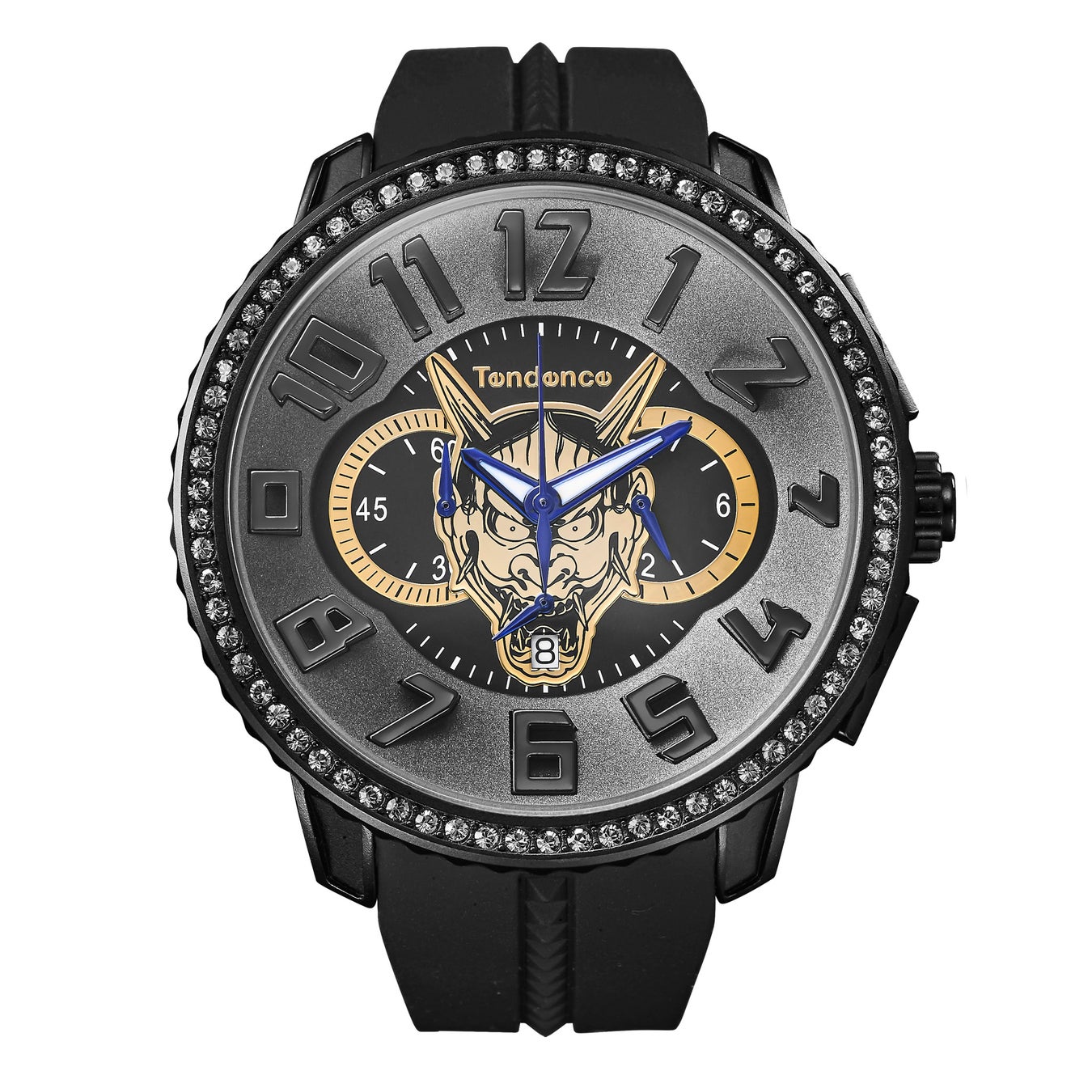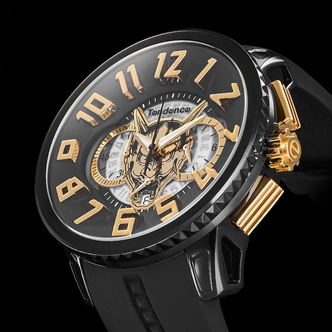 鬼の形相を見せる般若の相貌。真島吾朗の背中に刻まれた刺青を、ダイヤル中央に堂々鎮座させました。囲むようにそびえたつテンデンス特有の3Dインデックスが、般若の存在をさらに強調します。ブラック×ゴールドであしらわれたカラーリングは、物語の舞台となる裏社会の光と影を表し、妖しい魅力を放ちます。