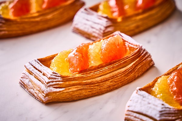 定期的に味を変えてご提供しているデニッシュの新作は、ホワイトチョコレートを入れた自家製のカスタードクリームを絞り、コンポートにした2種類の柑橘類を乗せて焼き上げた、酸味と甘みのバランスが絶妙な逸品です。