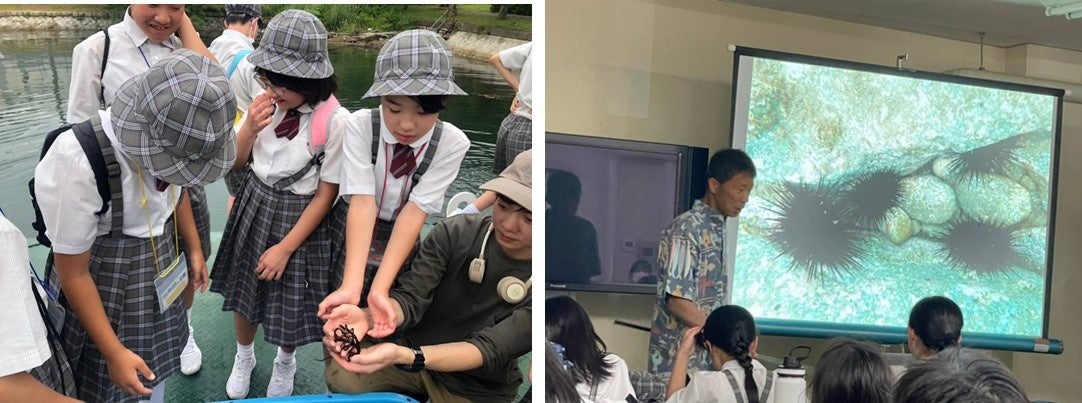 後半は京都大学舞鶴水産実験所で進められている海を守るための研究を見学し、舞鶴湾の生態系で起こっている異変について学びました。海藻を食べるウニが増えて磯焼けが起こっている現状を学び、翌日のウニの捕獲・解剖体験へと繋げます。