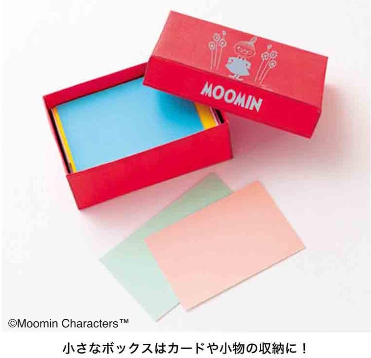整理収納にも最適なハガキサイズとカードサイズの2種のボックスに、新年の挨拶をするときにも重宝する一筆箋と3枚のポチ袋、そしてシール。すべてにリトルミイがデザインされた、おめでたさ満点のセットです。
