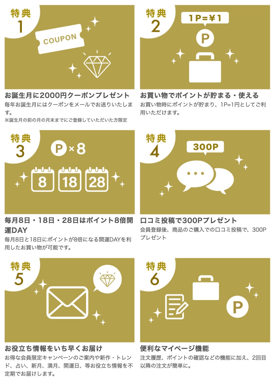 毎月のポイントアップデーや、口コミ投稿でのポイント付与、会員限定キャンペーンや開運情報のご案内などもお届けしています。